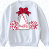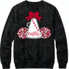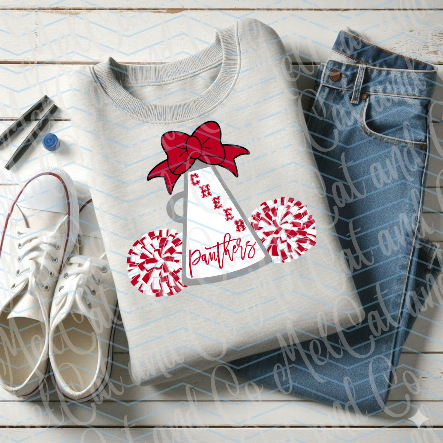 This bold and spirited graphic features a classic cheer megaphone, accented with a red bow and surrounded by red and white pom-poms, making it perfect for cheerleaders, parents, coaches, and fans.