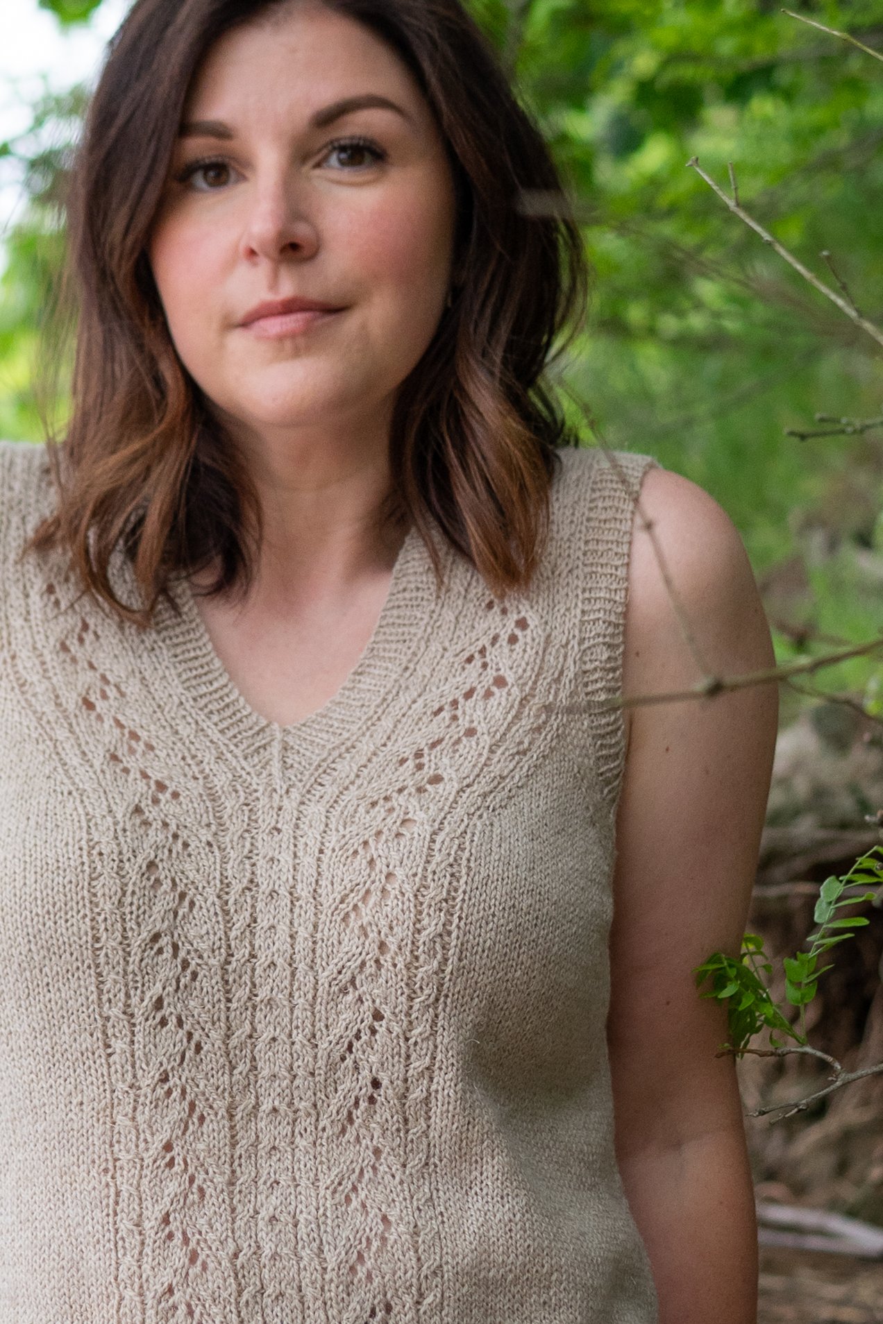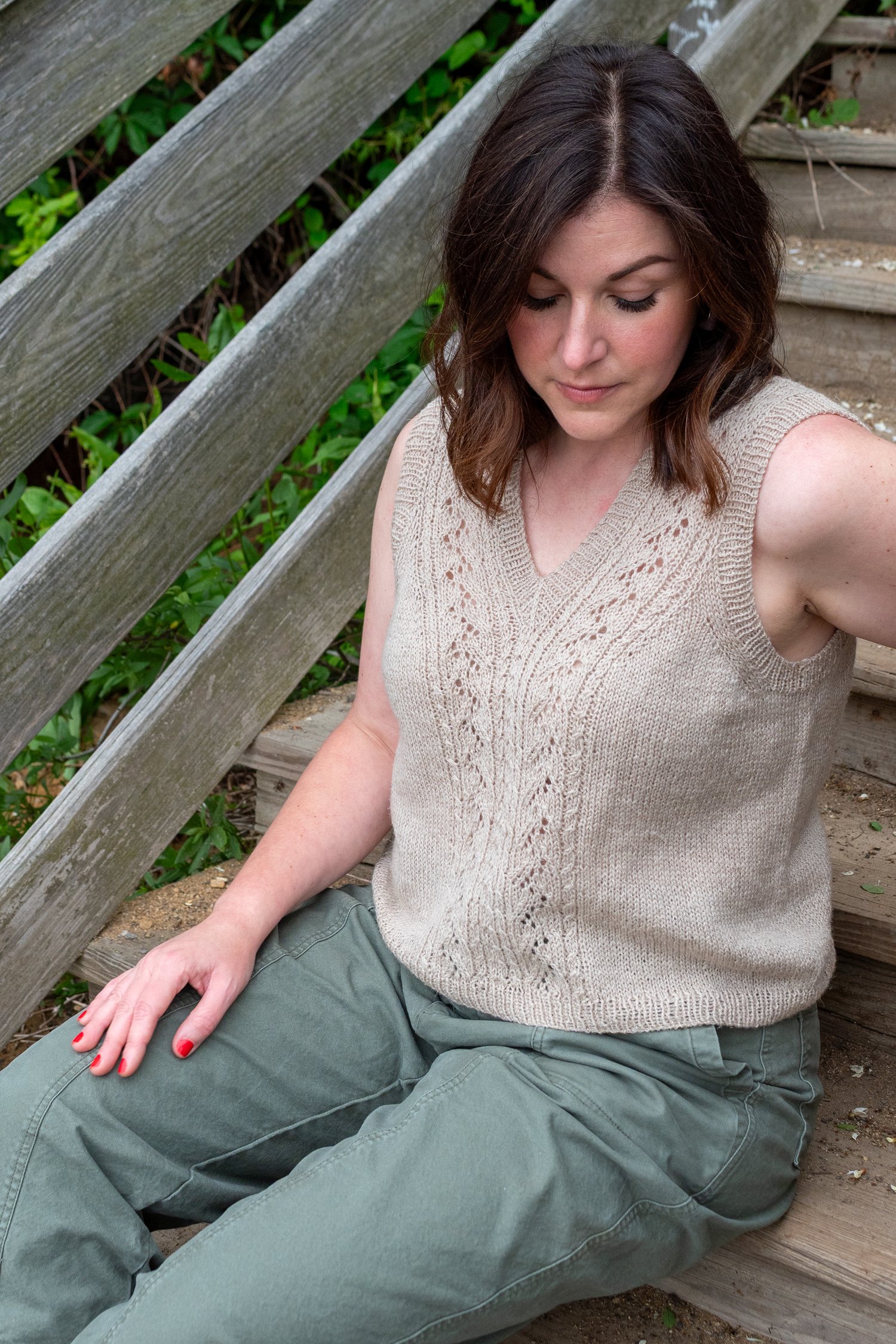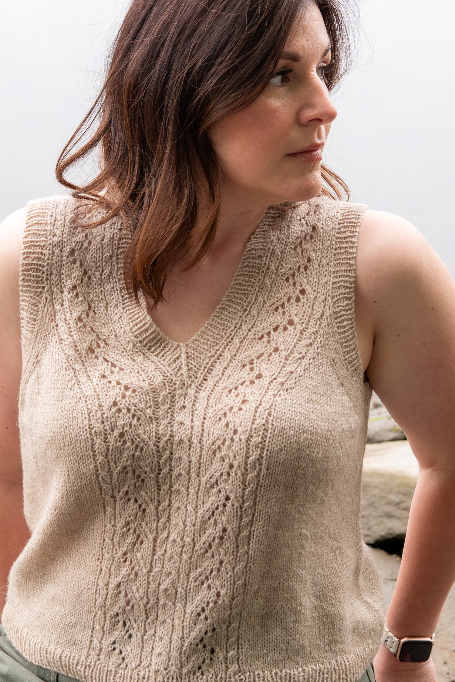 Summer Session is a V-neck tank worked from the top down. The back neck is cast on and shoulder shaping rows are worked before continuing to work flat to the arm opening depth. Left and right front shoulders are picked up and worked flat with shaping for the neckline and then for the armholes. Fronts and back are joined to work the body in the round. The tank features a lace motif worked from top to bottom on the front. Hem, armholes and neckline are finished with a 1x1 rib trim.