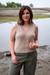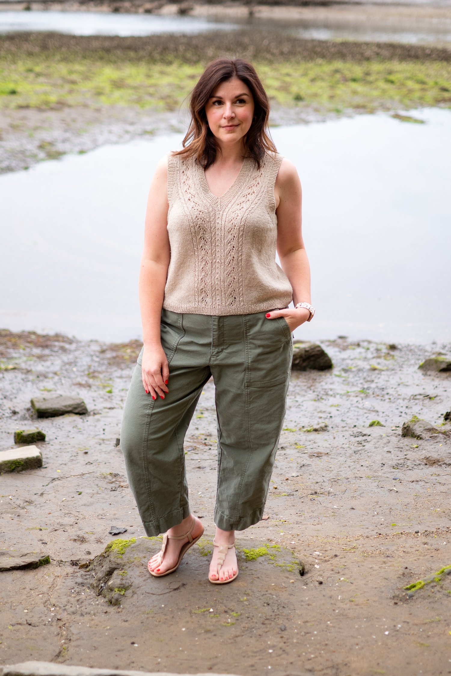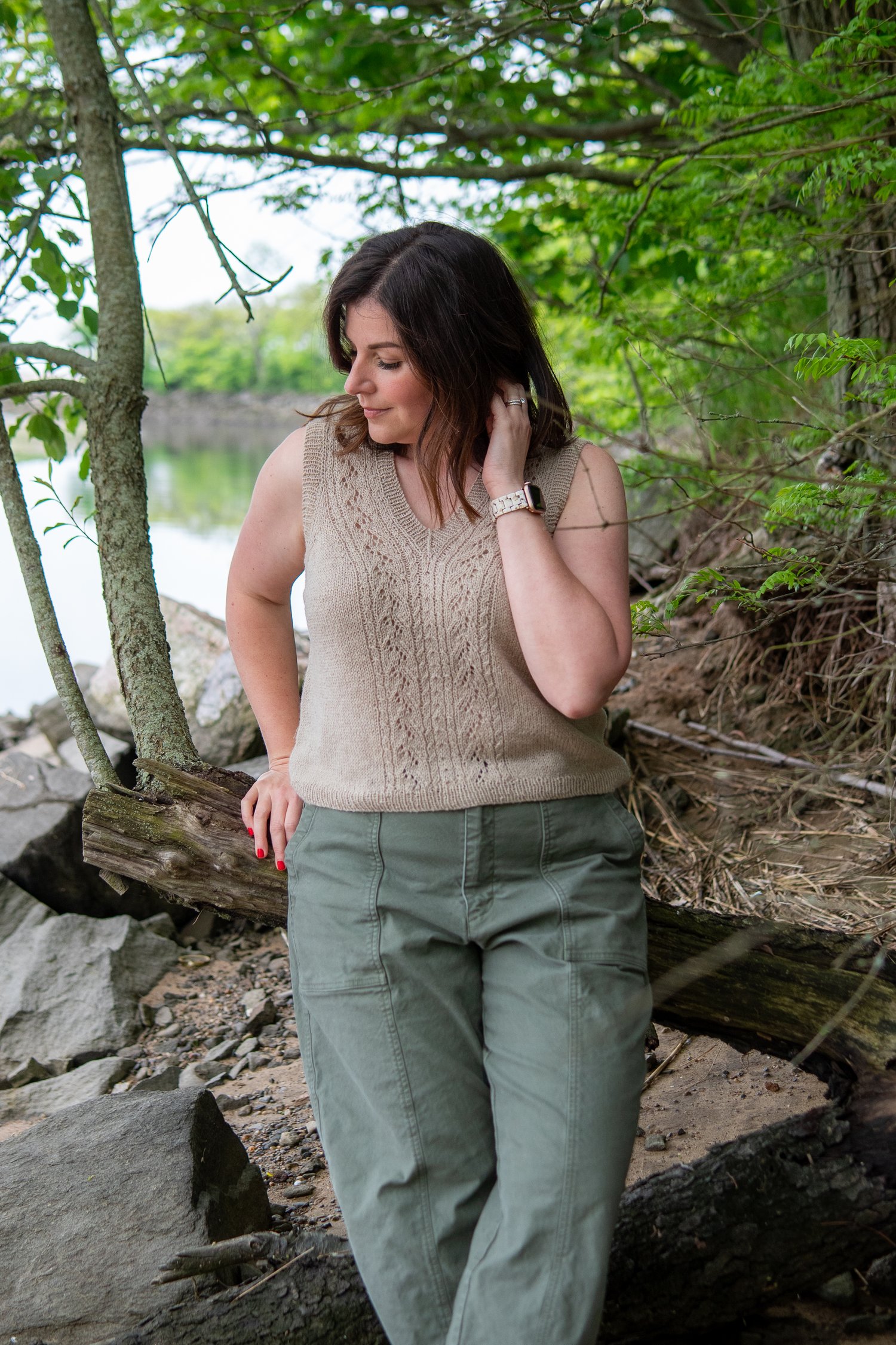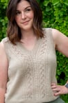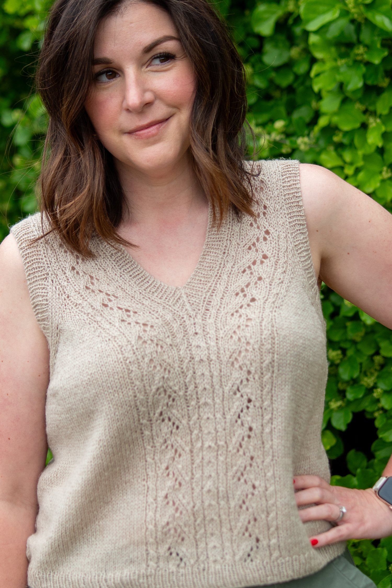 Summer Session is a V-neck tank worked from the top down. The back neck is cast on and shoulder shaping rows are worked before continuing to work flat to the arm opening depth. Left and right front shoulders are picked up and worked flat with shaping for the neckline and then for the armholes. Fronts and back are joined to work the body in the round. The tank features a lace motif worked from top to bottom on the front. Hem, armholes and neckline are finished with a 1x1 rib trim.