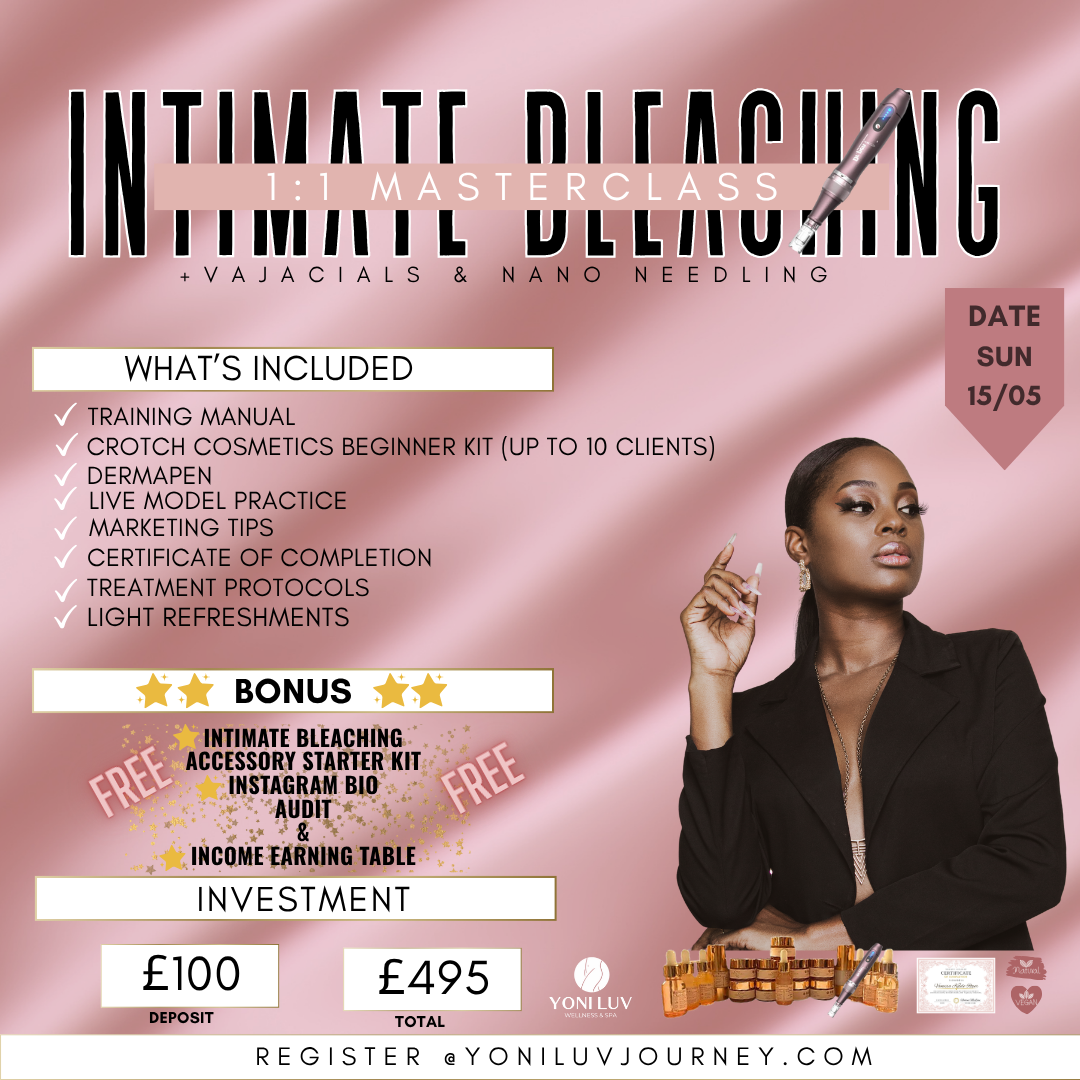You will attend a one day training with YoniLuv Academy in London, UK. The training will cover Intimate Lightening for the underarms, bikini line, inner thighs, pubic mound, peri-anal, knees, elbows, buttocks.