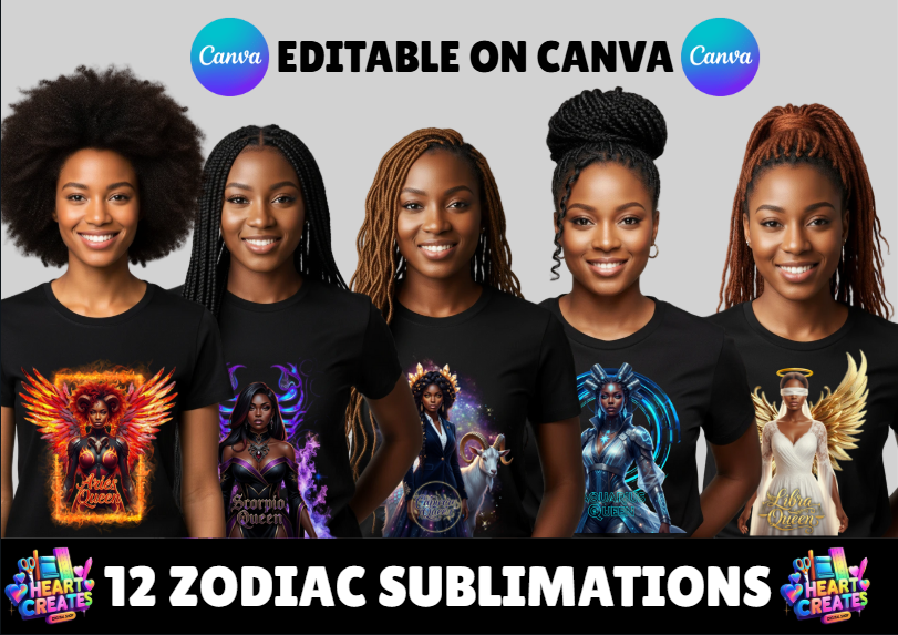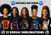 Express your unique astrological personality with our stunning set of editable sublimation designs featuring all 12 zodiac signs! Specially crafted for women, these vibrant and stylish graphics are perfect for creating custom t-shirts and apparel that showcase your zodiac pride.