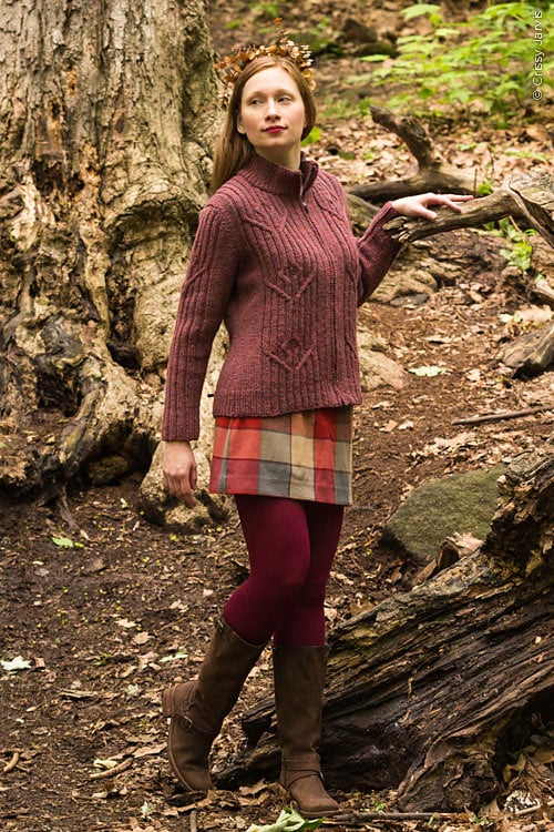 Increases/decreases, cabled decreases (optional), working cables from charts or written instructions, basic set-in sleeve sweater construction, English tailored shoulders, worked flat, bottom up, seamed, encased from selvedges, sewing in zipper.