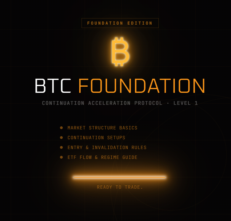 A precision framework for trading BTC continuation setups using ICT/SMC methodology. The same rigorous system as the ETH Foundation — rebuilt from the ground up for BTC market structure and behaviour.