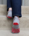 I designed these ankle socks with the spirit of this creative teacher in mind. Worked in a heavy fingering or sport-weight yarn, they knit up quickly and use a relatively small amount of yarn, with the portions worked in the contrast color suitable for using up leftover scraps or mini skeins. The stranded section of the foot is easy for even a beginner in colorwork techniques and adds cushioning and an improved fit to that part of the foot. Best of all, the many trapezoids that appear on the socks (in the heel turn, around the foot, and in the toe shaping) will ensure that your sock drawer stays Zoid free.
