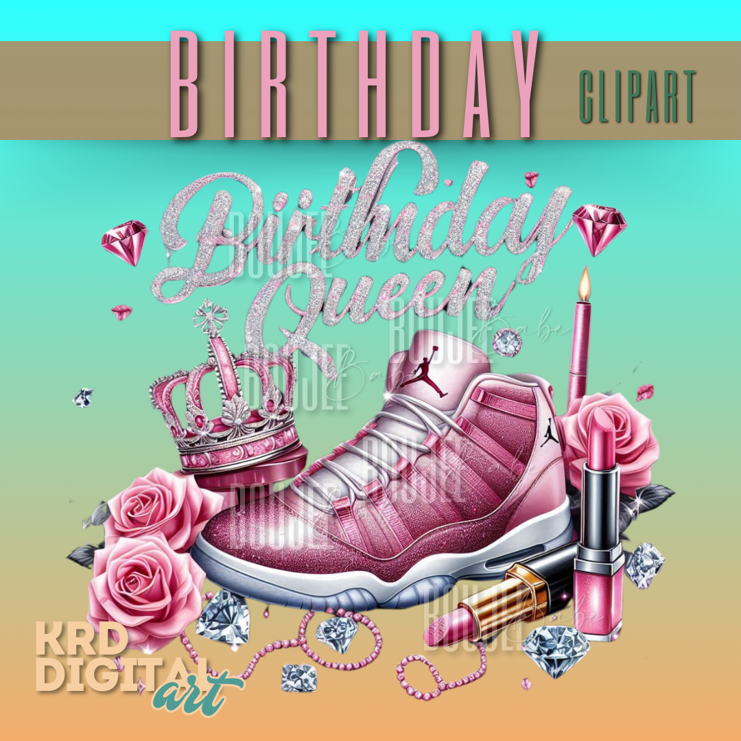 birthday queen png, pink heel png, glam birthday clipart, crown png, roses png, lipstick png, girly png, bling png, sublimation png, tshirt design png, cricut png, silhouette png, canva clipart, party favor png, birthday svg alternative, transparent background png, boss babe birthday, glam aesthetic, high heel clipart