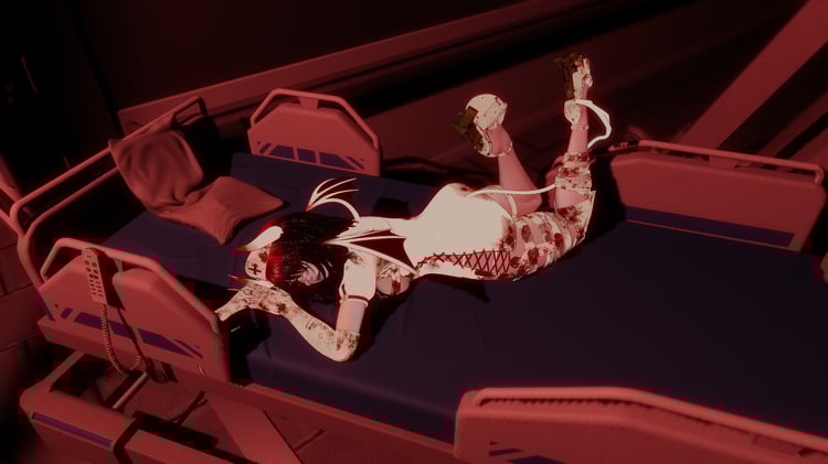 Now she wanders the halls in crimson, whispering comfort as she draws her needle across the skin. Her touch feels like mercy… until it burns.