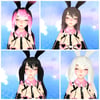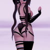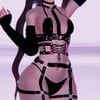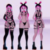 • Outfits 1+2, Gloves, Harness Top & Bottom, Hair from long to pigtails, Bun ears, Bun tail, Thigh highs, Boots, Mini Corset.