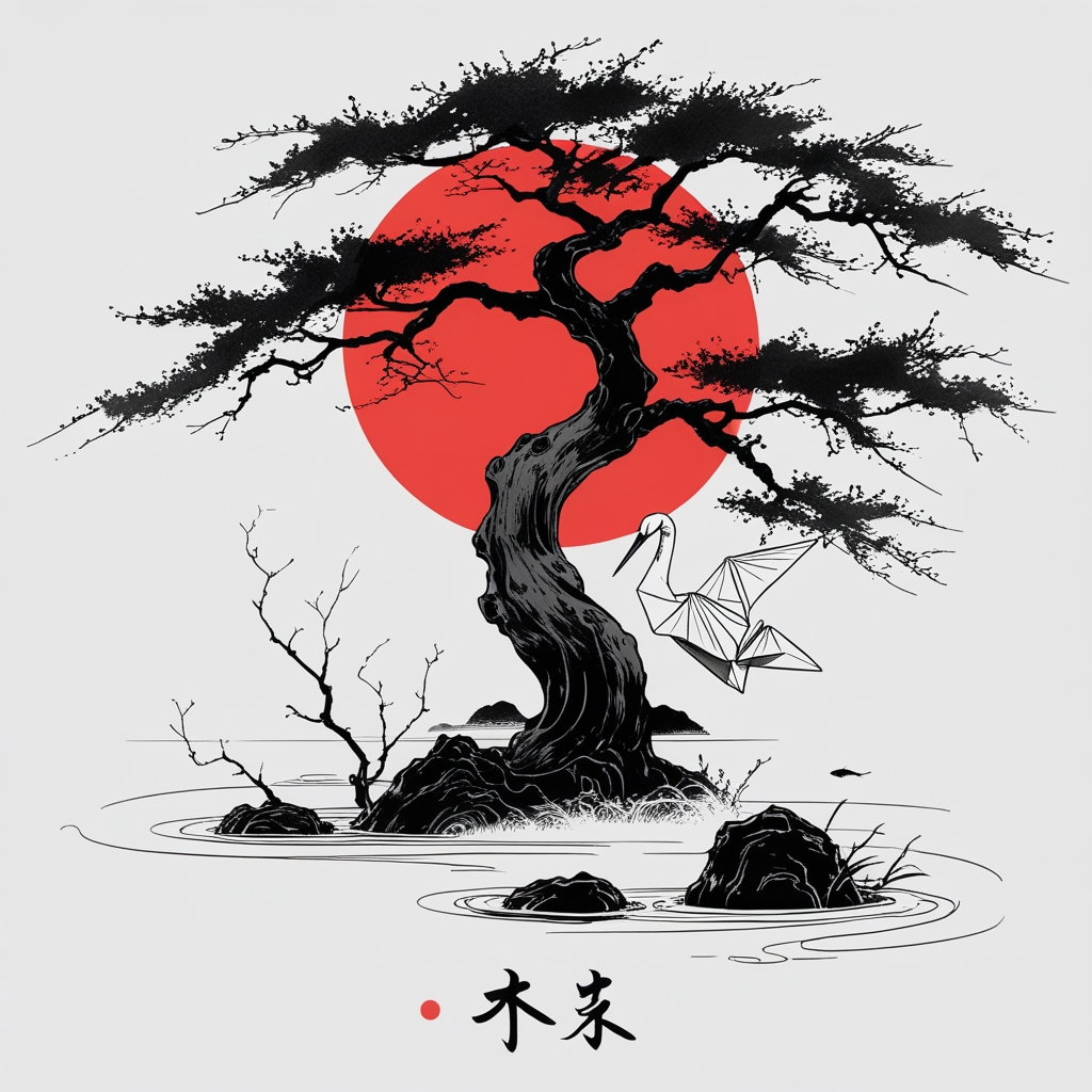A high-quality manga-style illustration with clean, sharp edges and no background. A dark, ancient tree with intricate black bark and dense, flowing leaves, drawn in detailed black ink style. Behind the tree, a bold red sun in traditional Chinese ink-painting style (minimal brush texture), placed in a perfectly balanced composition. Below the tree, a subtle koi fish pond in black-and-white ink style. A single, finely folded origami crane in soft gray ink lines is gently perched on one of the tree branches, symbolizing hope and peace. Below the design, the Japanese kanji “平和” (peace) is written in elegant brush-style calligraphy. The entire design is isolated on a pure white background — no sky, no characters, no scenery. Made for clean printing on a white t-shirt: minimal, bold, serene, and trendy.