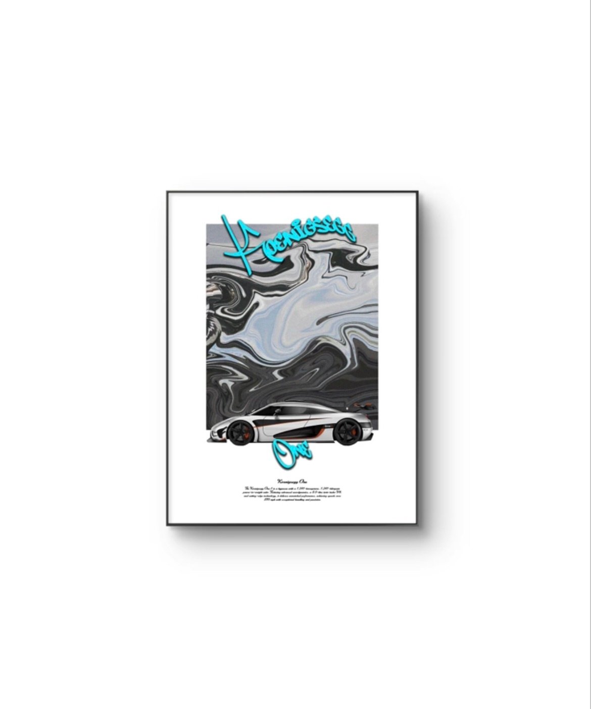 This poster showcases the Koenigsegg One:1, a groundbreaking hypercar known for its unmatched performance and cutting-edge technology. With a 1,341 horsepower engine and a weight of just 1,341 kg, it represents the perfect balance of power, speed, and aerodynamics, pushing the limits of automotive engineering.