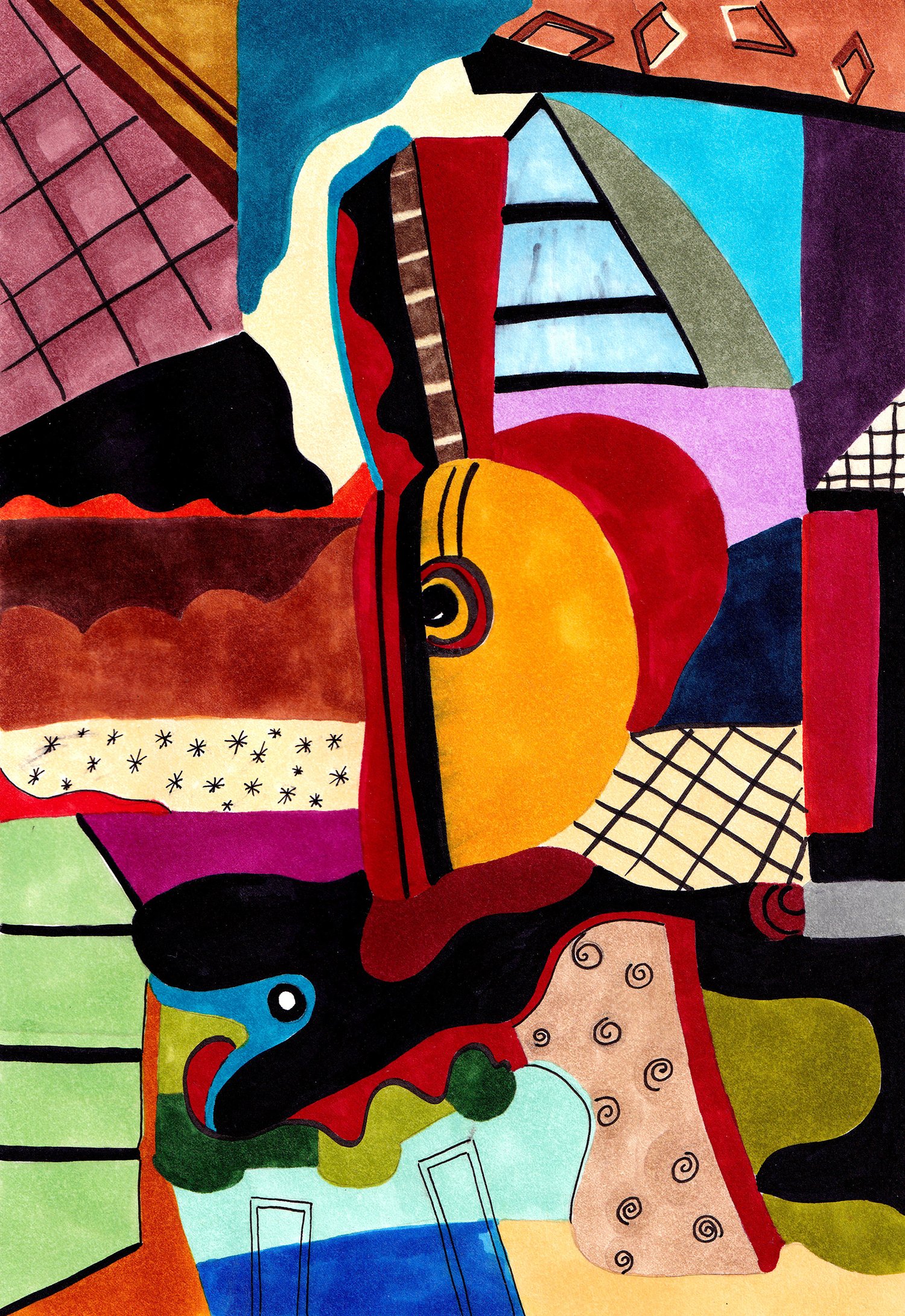 Picasso inspired acrylic abstract collage illustration comprising squiggles, random objects, insects, patterns and shapes using a varied colour palette.