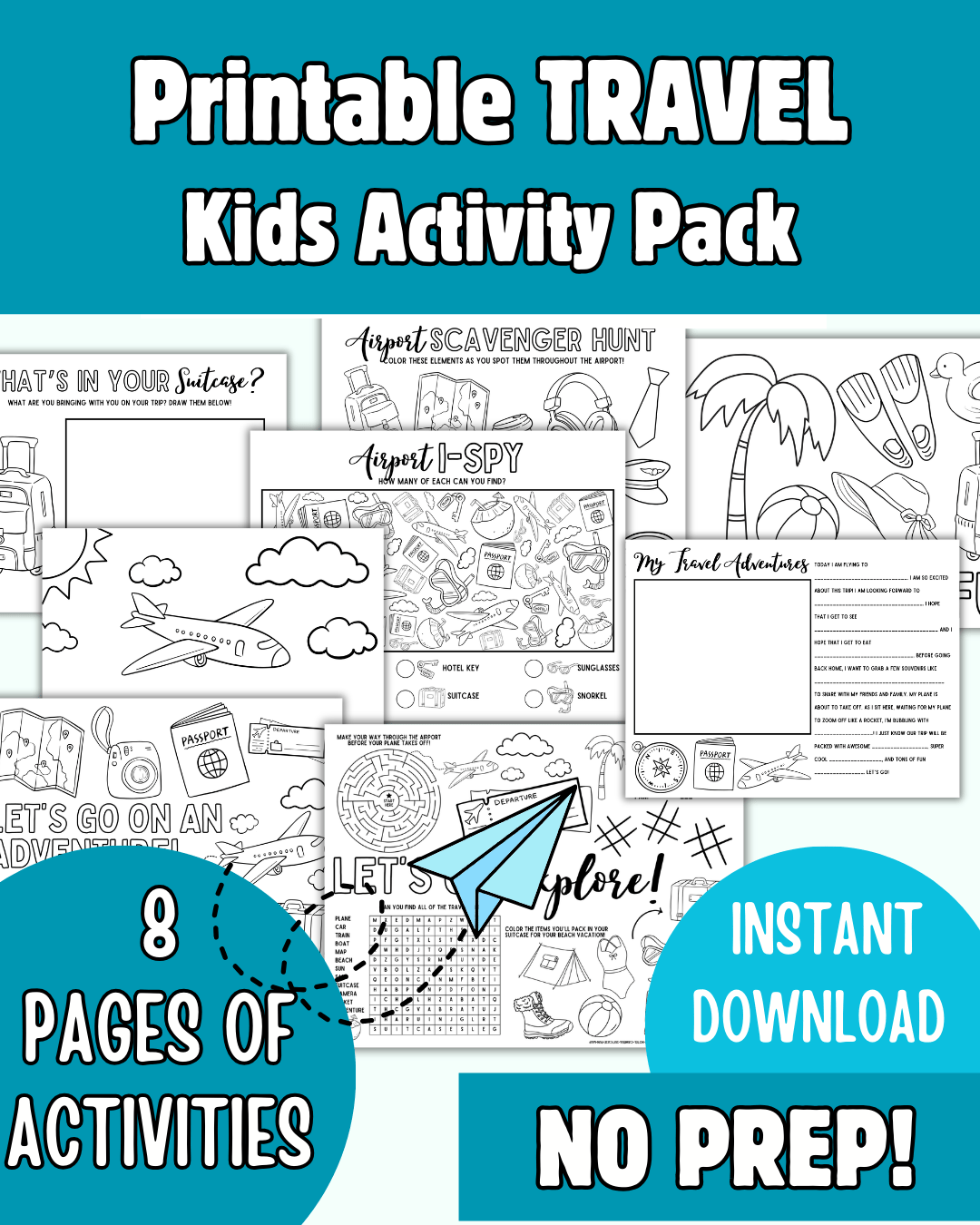 Embark on an adventure with this travel-themed activity bundle for kids, packed with engaging coloring pages, puzzles, and games. Perfect for keeping young explorers entertained during their journey, this activity set promises hours of fun and excitement!