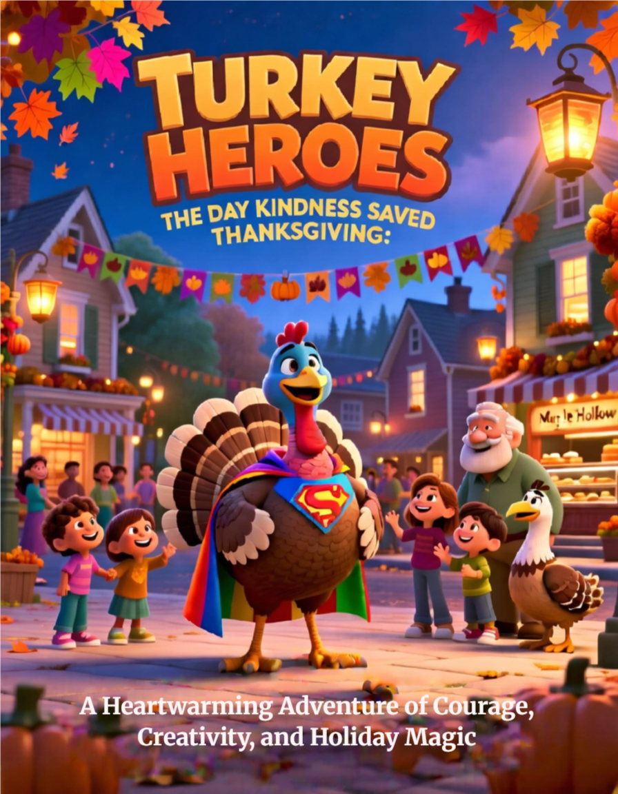 “Turkey Heroes: Saving Thanksgiving” is a beautifully crafted spin-off story inspired by the popular Turkeys on Strike universe. This project features a digital storybook PDF designed for children ages 4–12, blending charming storytelling with warm holiday themes. The narrative follows a group of young turkeys who must work together to save Thanksgiving after the grown-ups mysteriously disappear. Ideal for digital portfolios, storytelling showcases, and printable children’s books.
