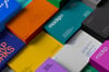 High-resolution business card mockup featuring 14 stacked card compositions in a top view layout. 5000 x 3600 px PSD with optional paper textures for branding presentations.