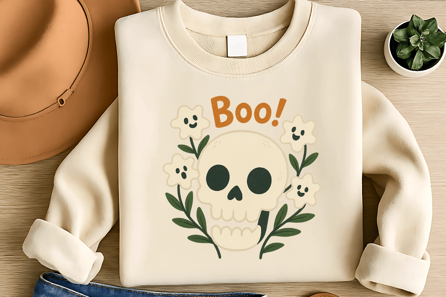 Ghostly Bloom Skull Sublimation PNG – “Boo!” Spooky Halloween T-Shirt Clipart – Creepy Cute Theme – 300 DPI Instant Digital Download
