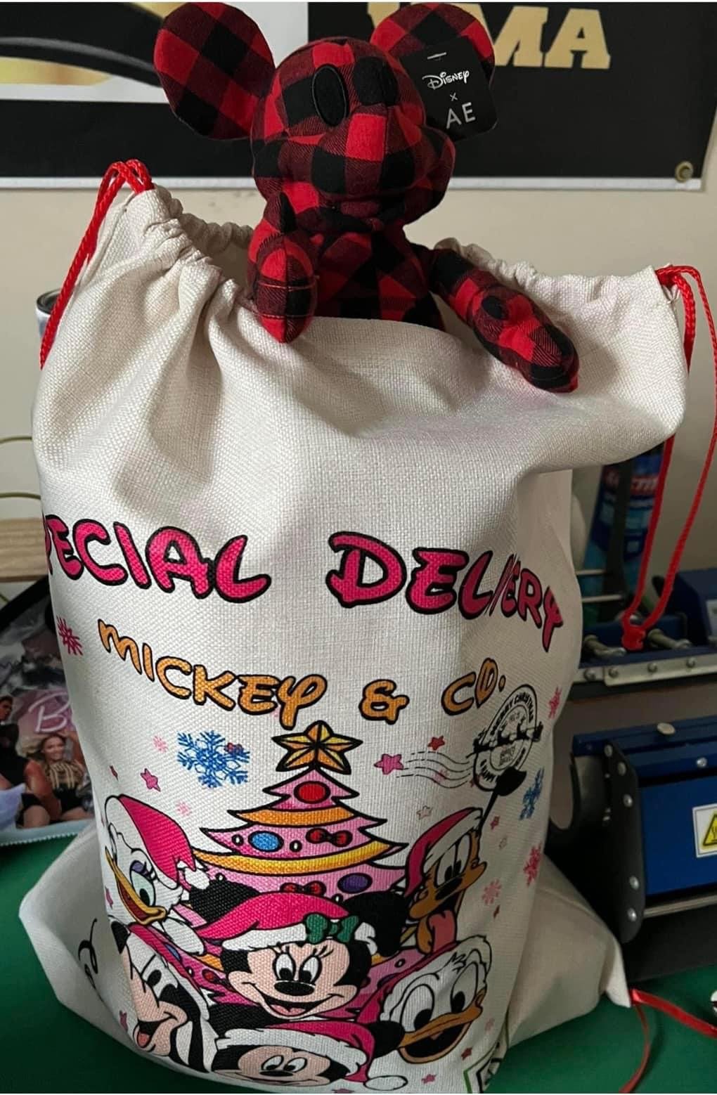 Custom Santa sac one cones with the design of choice from the size 19x26 inches made of Canva high quality thick material. Add one name for customization