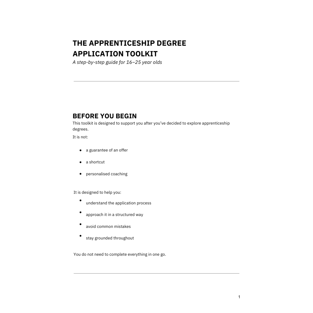 A practical application toolkit for 16–25 year olds exploring apprenticeship degrees, designed to support calm, informed, and well-prepared applications.