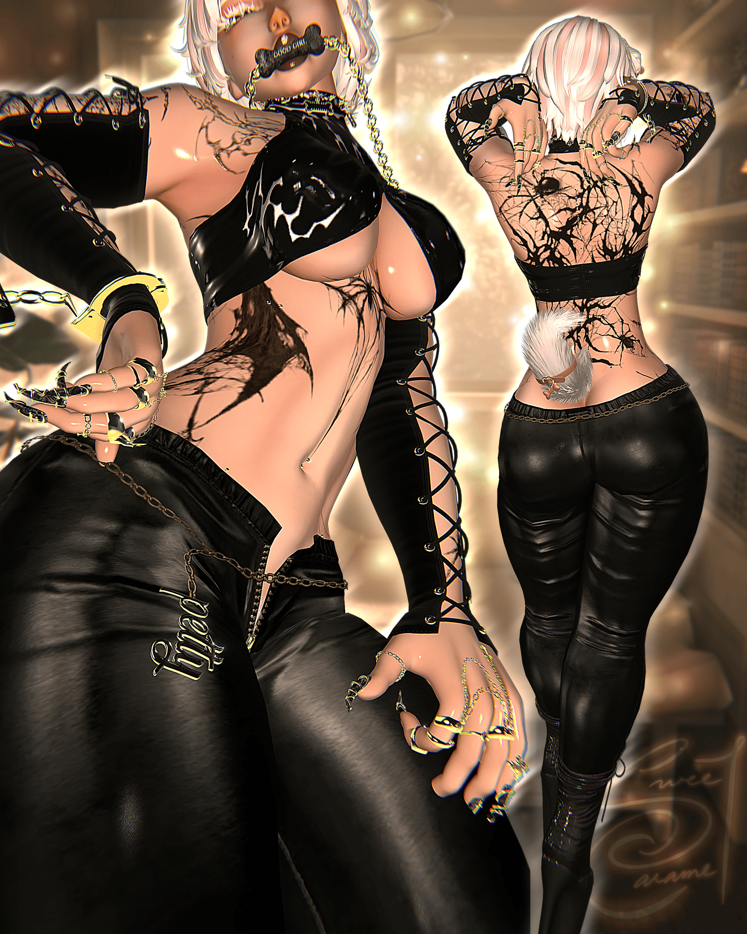 Bone Gag, Handcuffs, Heart Chain, Necklace, Rings, Body/Face Piercings]