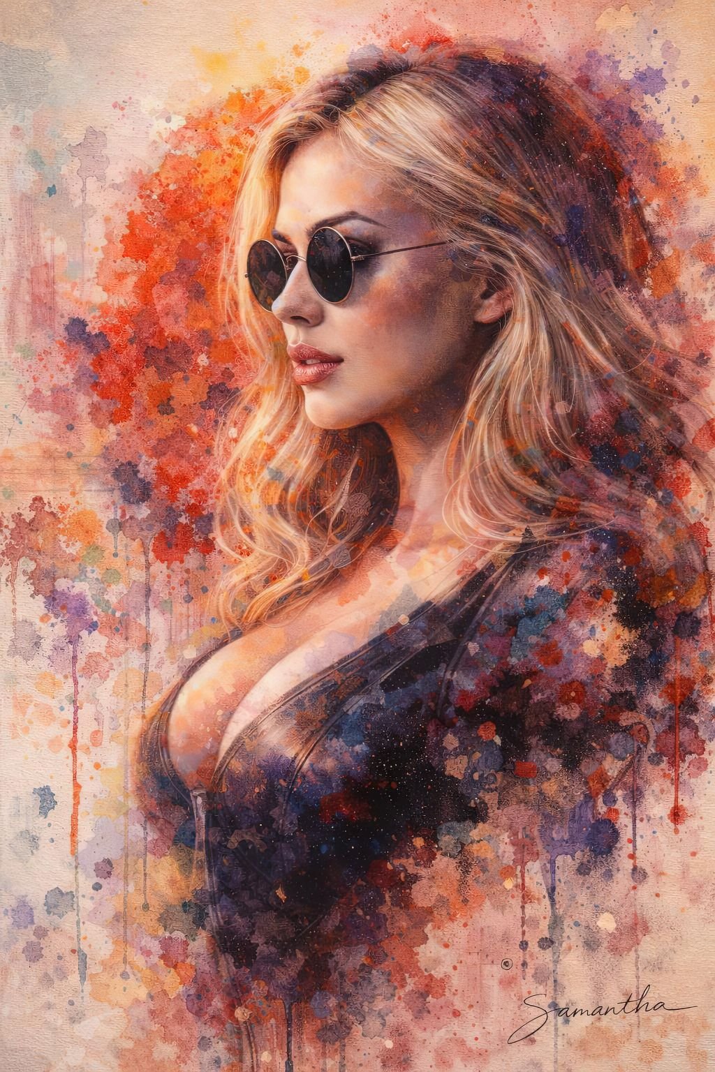 This is me in my truest form—not a role, not a costume, not a scene to perform. Just Samantha: composed, deliberate, and quietly untouchable. The dark glasses aren’t there to hide; they’re there to set the distance, to keep the focus where it belongs—on intention. Color erupts around me like controlled chaos, as if the canvas can’t contain what I’m holding back. I’m not asking to be understood in this portrait. I’m claiming my space as the one who creates.