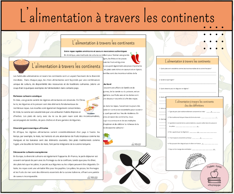 Les habitudes alimentaires à travers les continents sont un aspect fascinant de la diversité à travers le monde. Dans ce texte informatif, l'élève sera amené à explorer les diversités culinaires dans les pays tels que : l'Inde, le Mexique, le Kenya, la Chine, l'Algérie et les États-Unis.