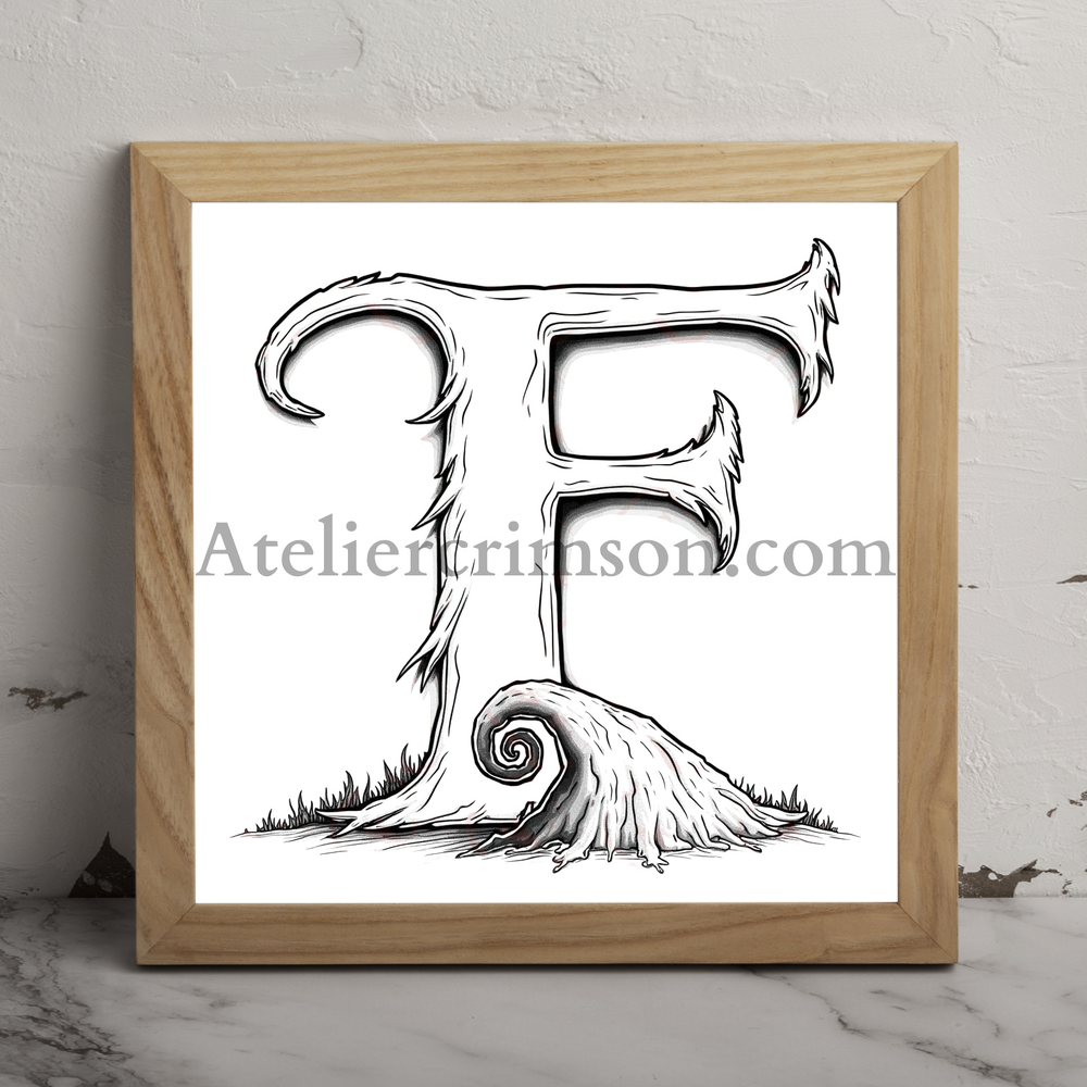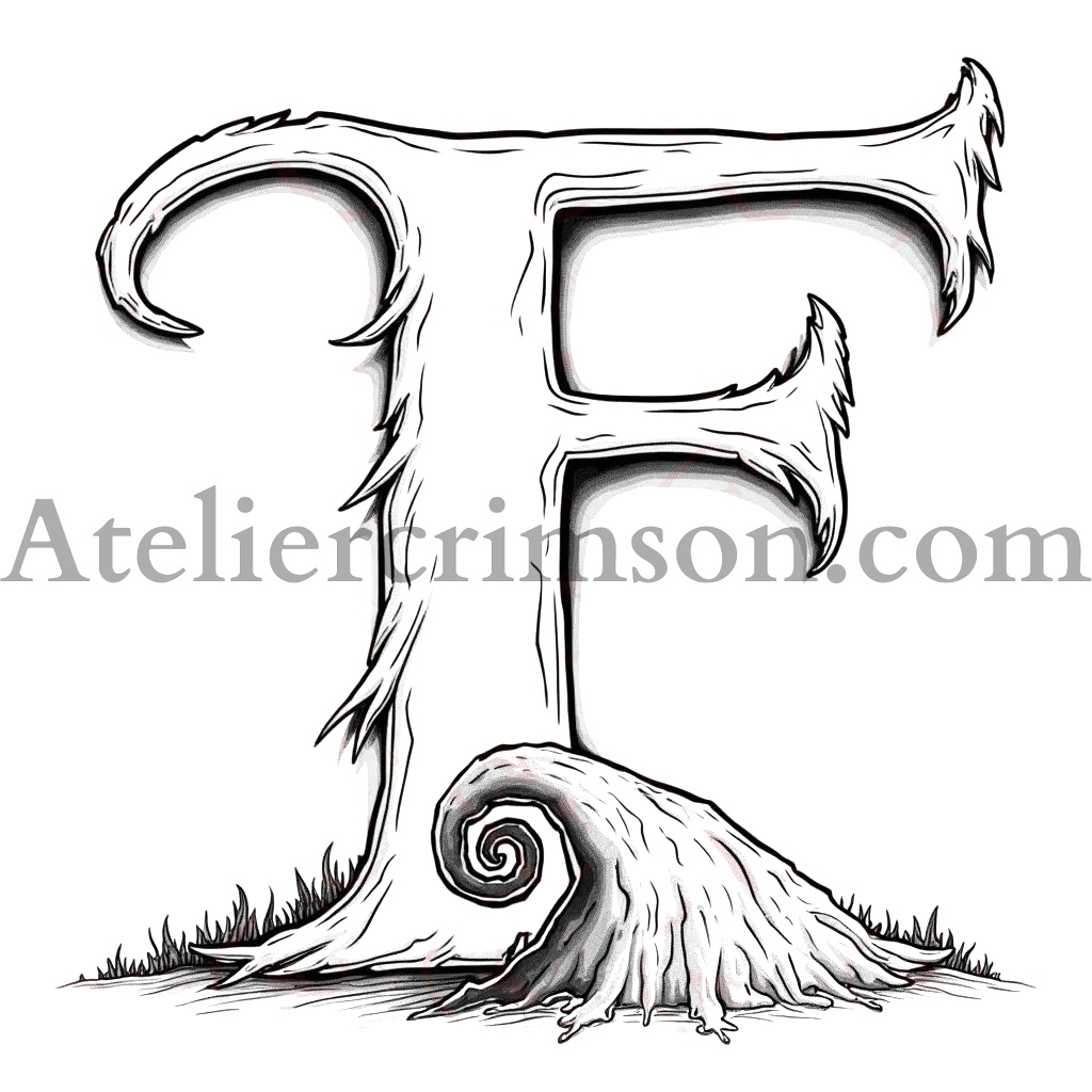 The letter F colloring book jack halloween Tim Burton-inspired alphabet art. Spooky-cute character in coloring book style. Perfect for Halloween crafts or gothic decor.