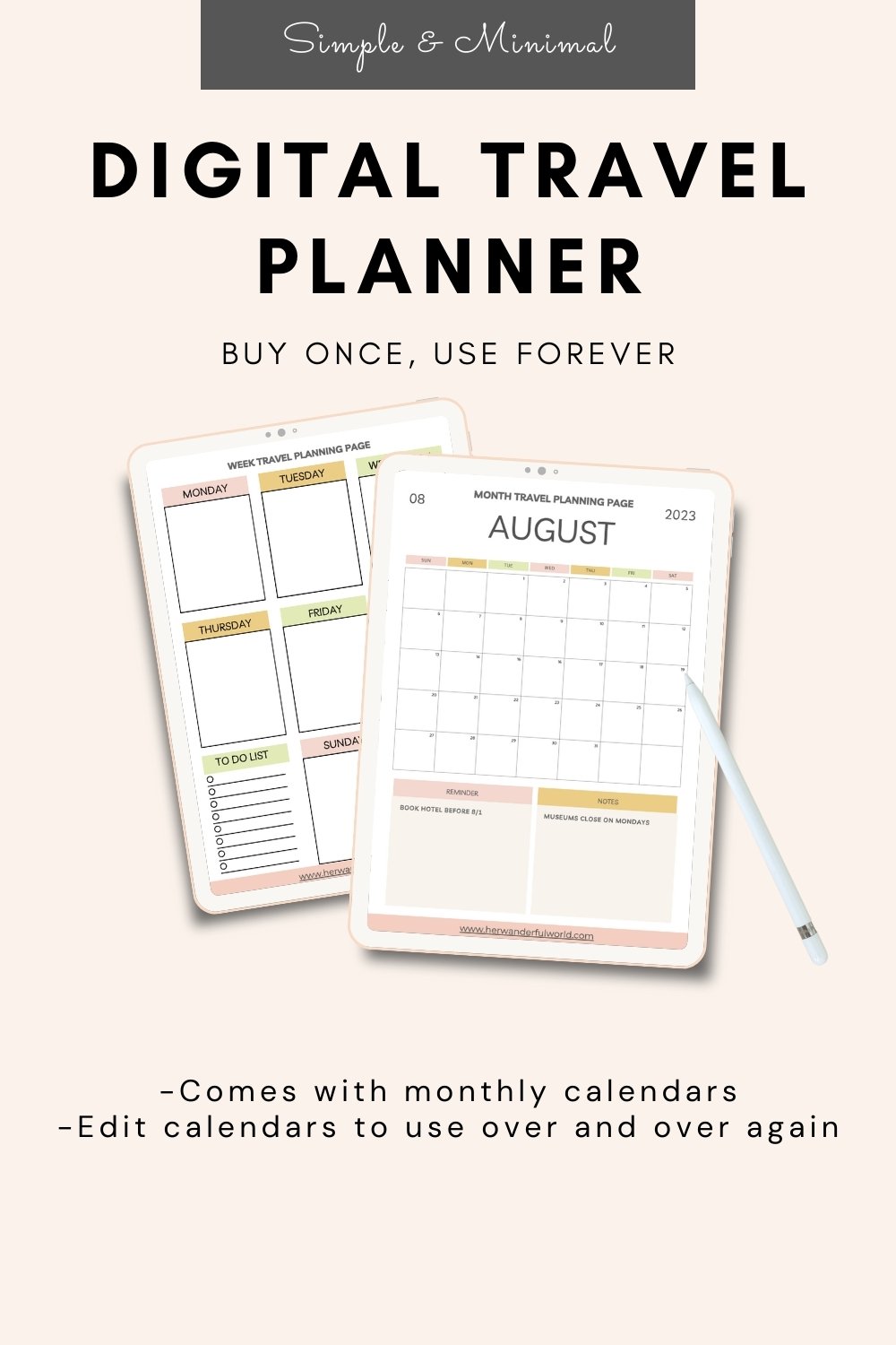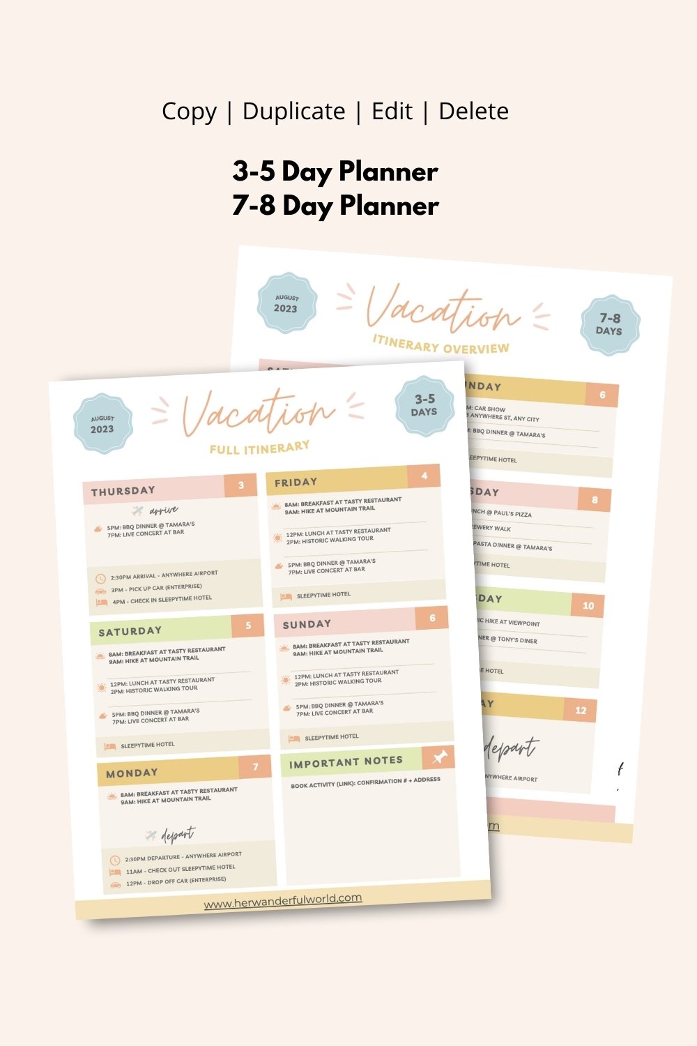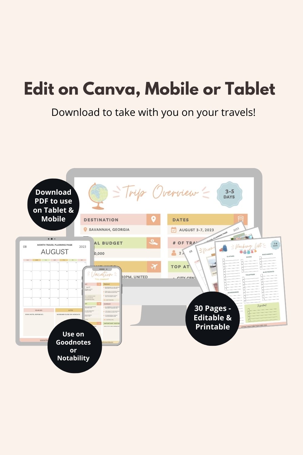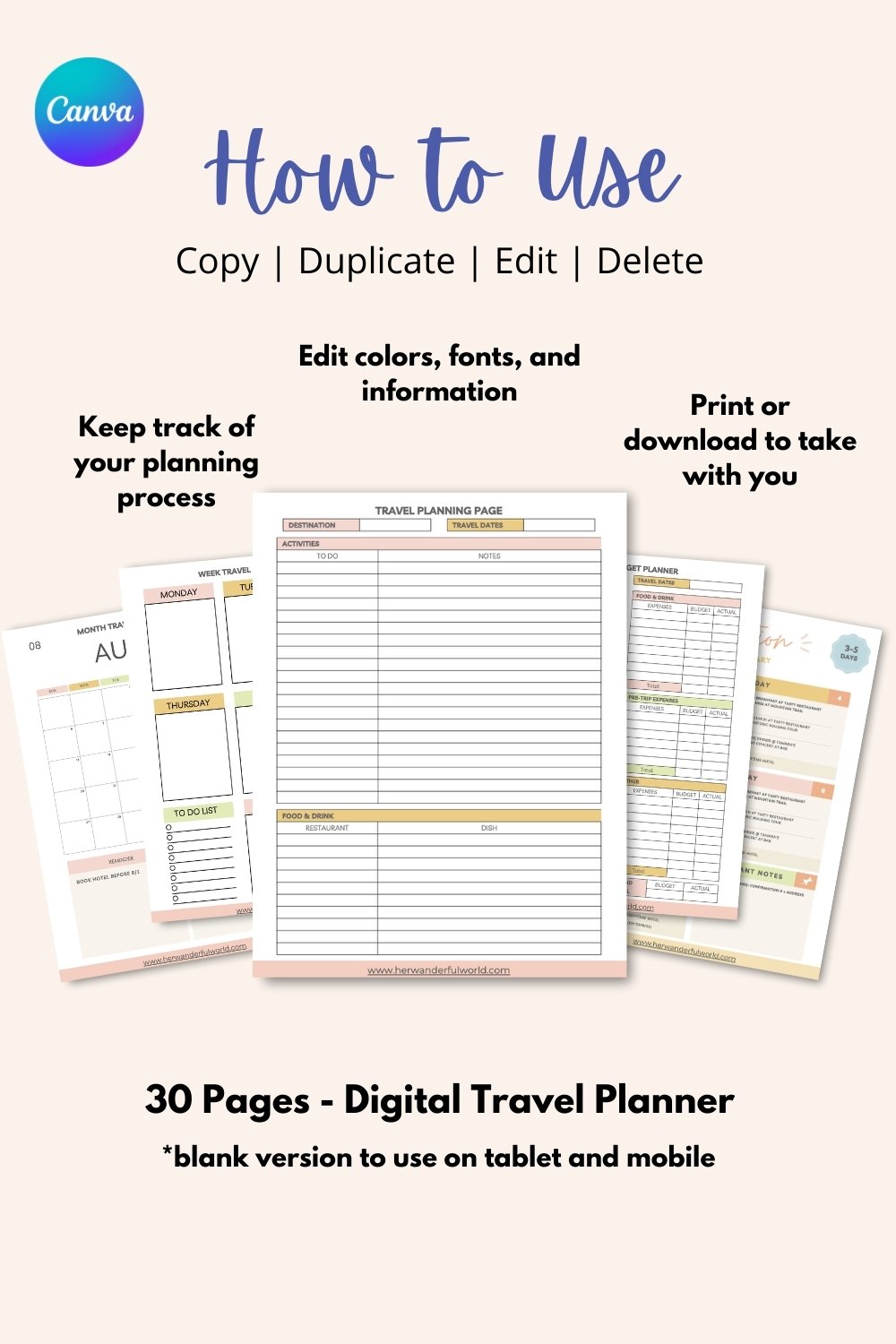You can customize the planner to fit your needs and travel preferences by editing directly in Canva or printing a blank version to write in your travel plans.