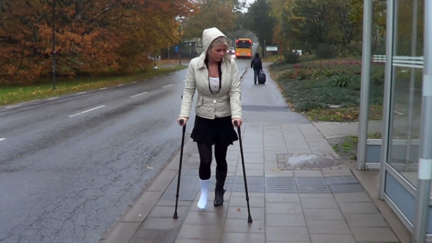 It's a rainy day in Sweden when Ice crutch from the bus stop towards the old castle.She has a white sock on her hurt right foot and must use crutches.Since this is not Ice's first time on crutches she is using a boot with a heel on hel left leg and crutch without problem almost all the way to the castle.