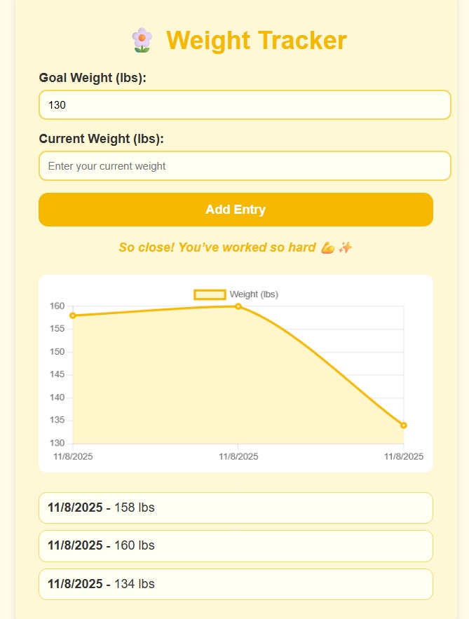 This web app is a simple weight tracker designed to help you log and track your weight over time. It is not a food or calorie tracker — it’s just a straightforward place to monitor your progress and stay motivated! 🌼