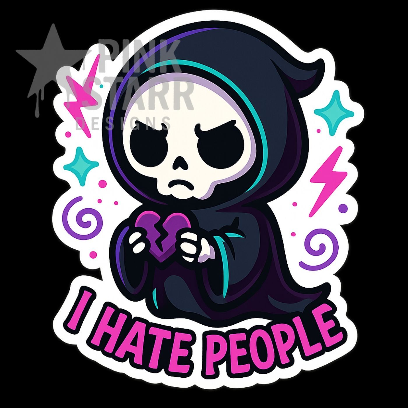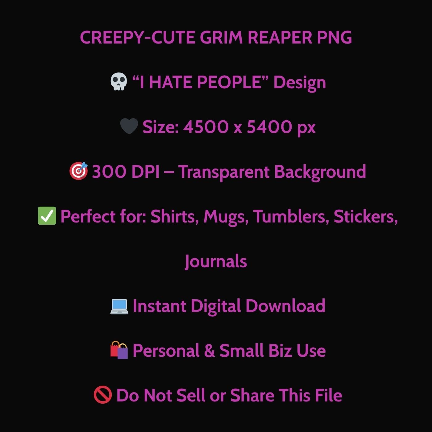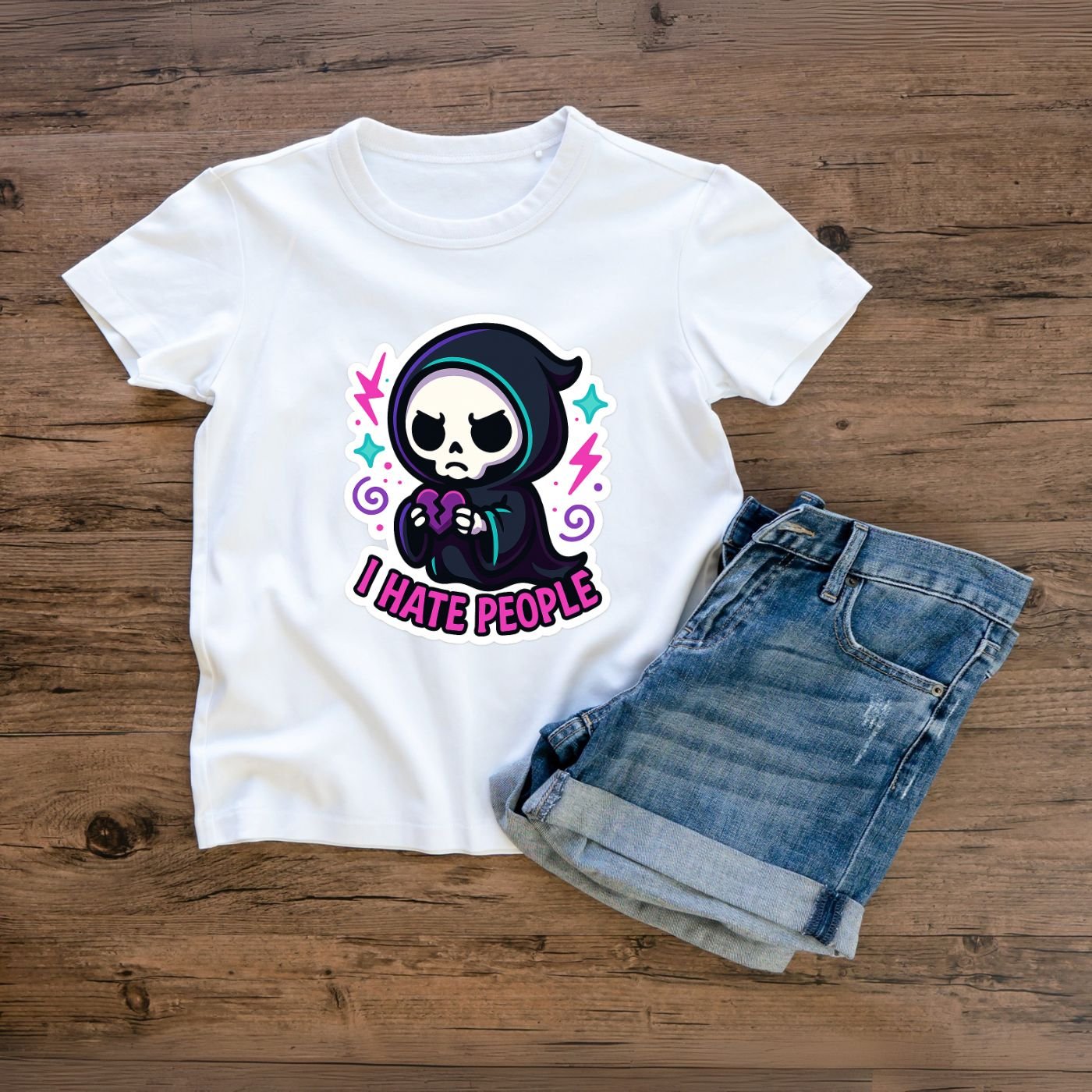 Cute Grim Reaper PNG – “I Hate People” Sublimation Design for Shirts, Mugs, Stickers