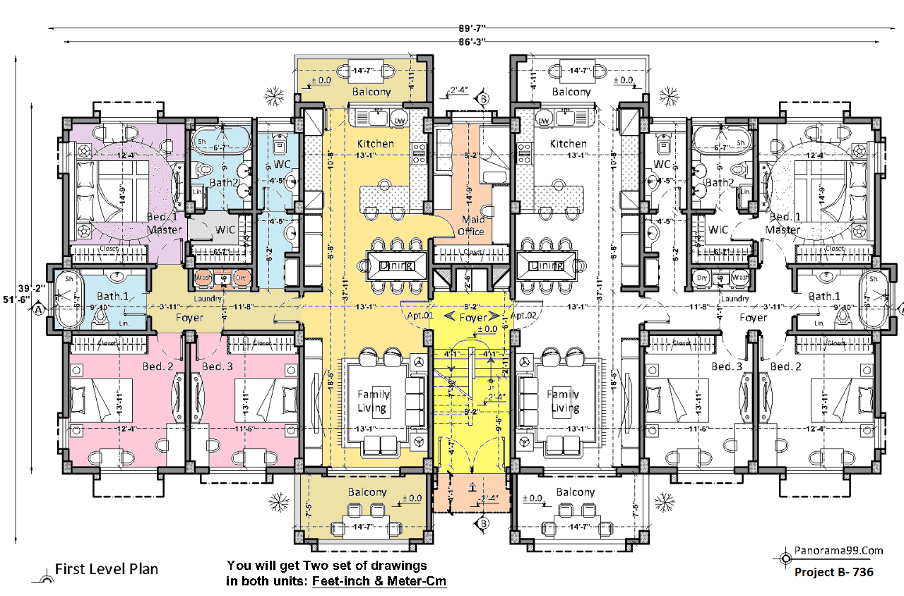 B-736| Apartment Building Plans – 6-Flat Complex with 2 and 3 Bedroom Units