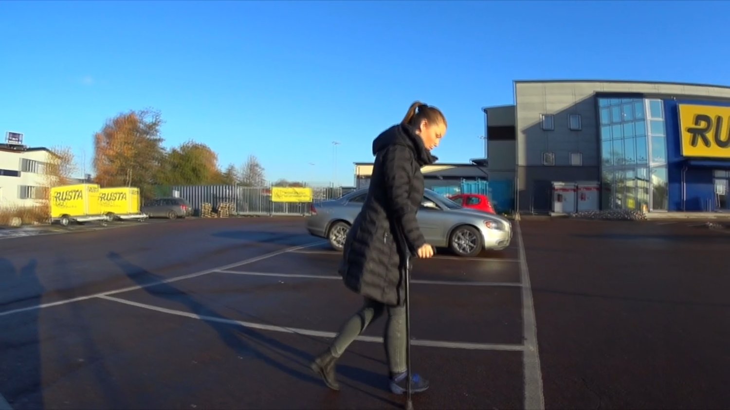 Melinda walks with ais of crutches and is on her way in to a store.She has a SLC on her right leg which today is protected by a black sock and a cast shoe.We see her crutch but she also try walk with the help of her cast shoe in this clip.