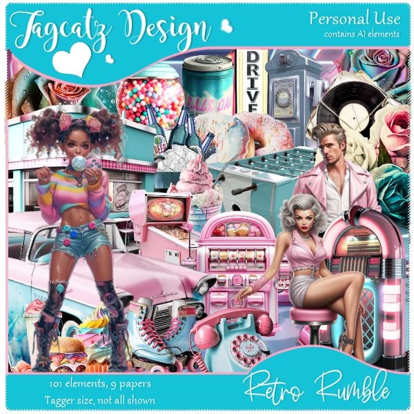 Retro Rumble - at the arcade, the bowling alley, the pool hall, the drive in or the malt shop - it's all here! 101 elements and 9 papers - including three tubes. Mostly AI products and papers. Tagger size. Not all shown.