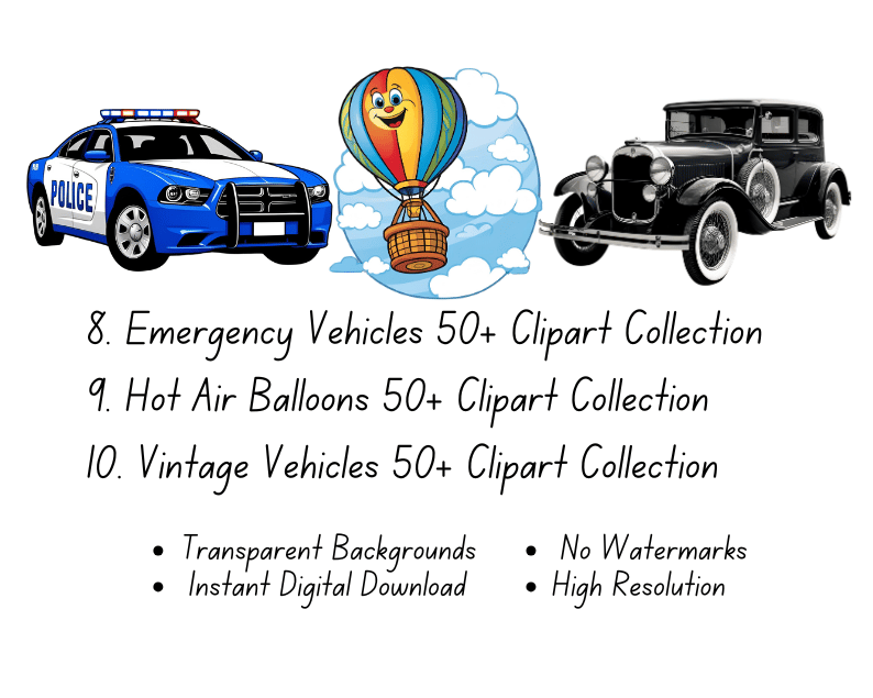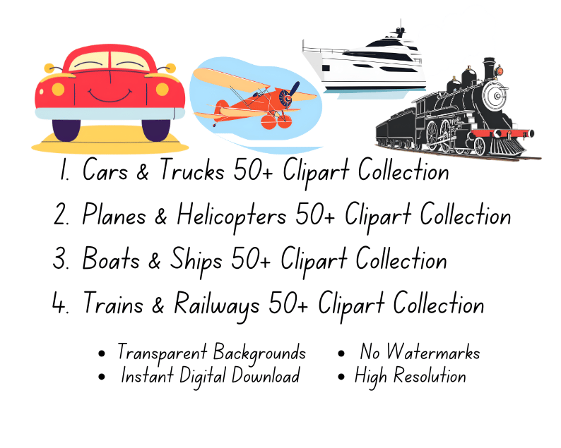 Transportation Clipart Bundle Collection | 12x12 Inches | High-Resolution Digital Printables | Instant Download