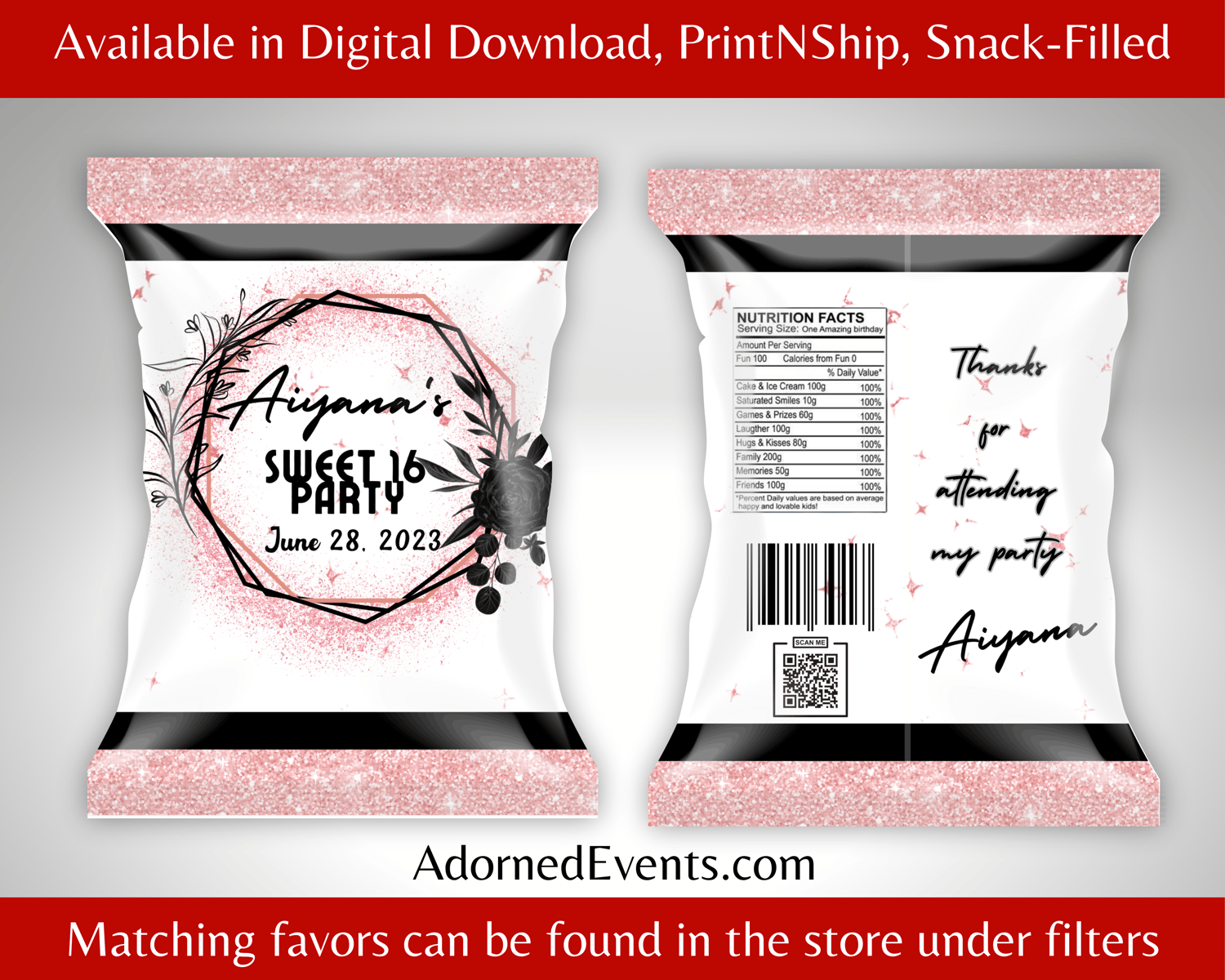 Sweet 16 Chip Bag Wrapper -Black- pink, rose gold