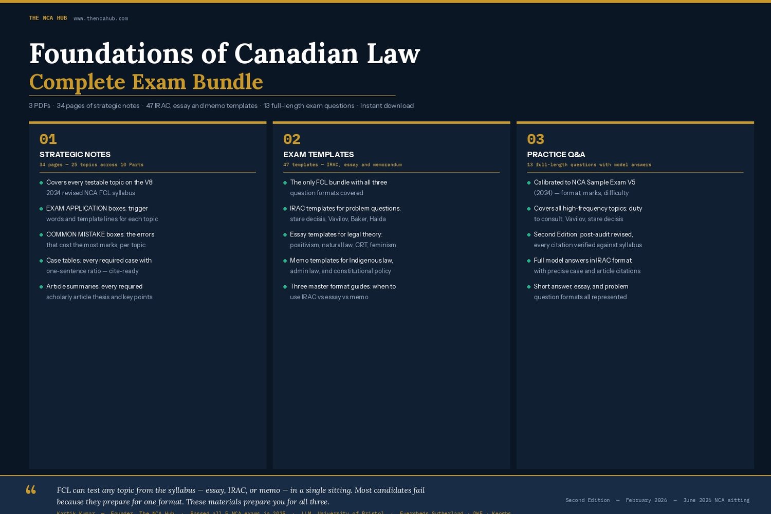 The FCL exam is the most structurally unpredictable NCA exam. In a single three-hour sitting, you can face a legal theory essay, an IRAC problem question on judicial review, and a legal memorandum on Indigenous law — all requiring completely different answer formats and different bodies of law.