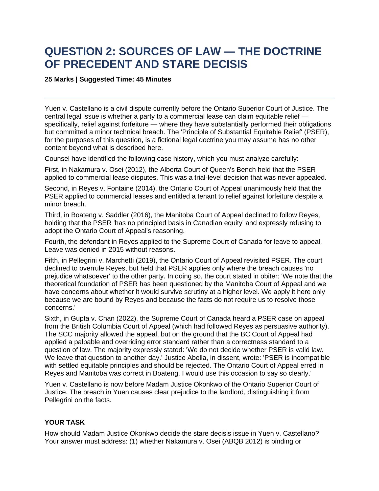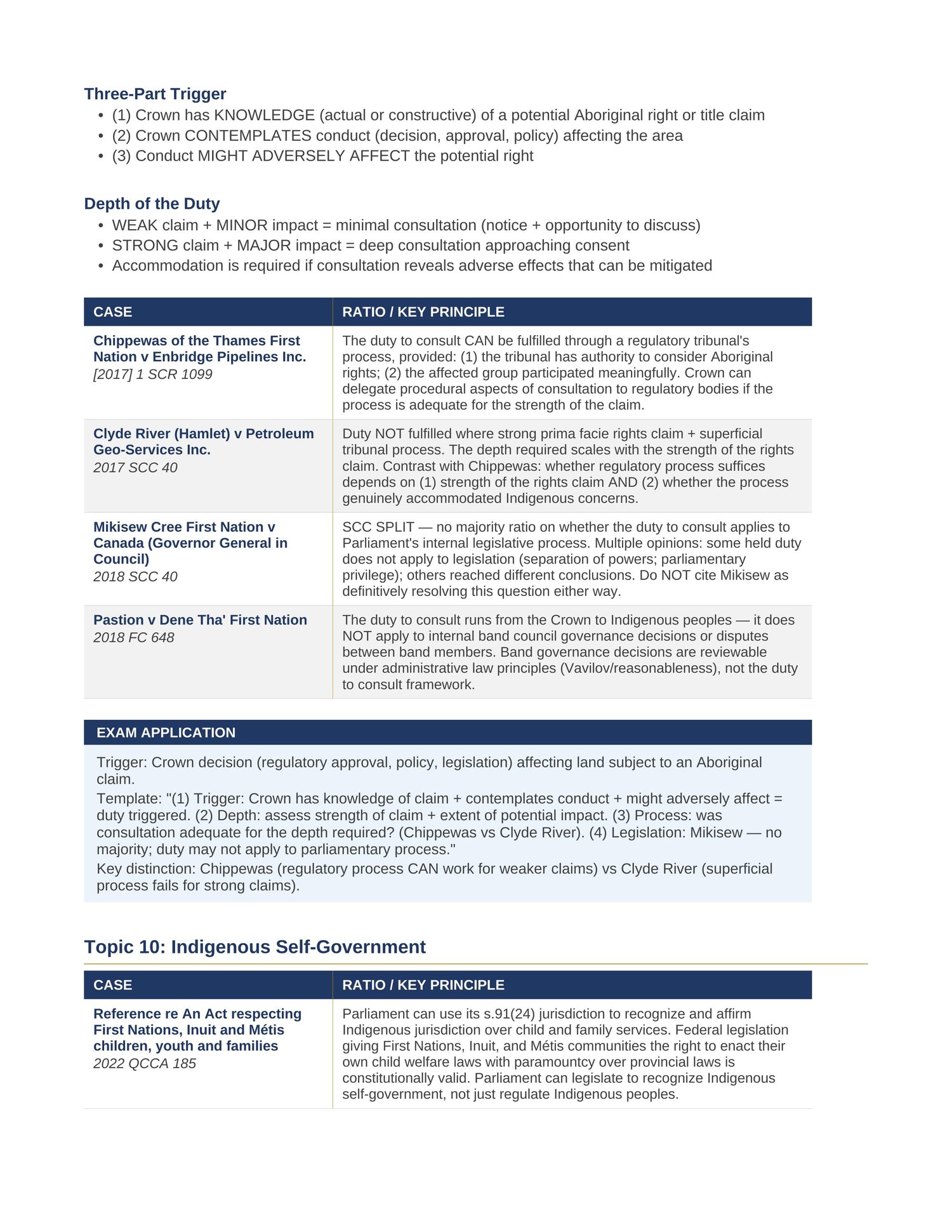 Questions cover: Indigenous law and duty to consult, doctrine of precedent and stare decisis, Vavilov standard of review, legal theory, statutory interpretation, rule of law and parliamentary sovereignty, international law and domestic courts, parliamentary privilege, Crown prerogative, Aboriginal title, judicial independence, Senate reform, and feminist and critical legal theory.