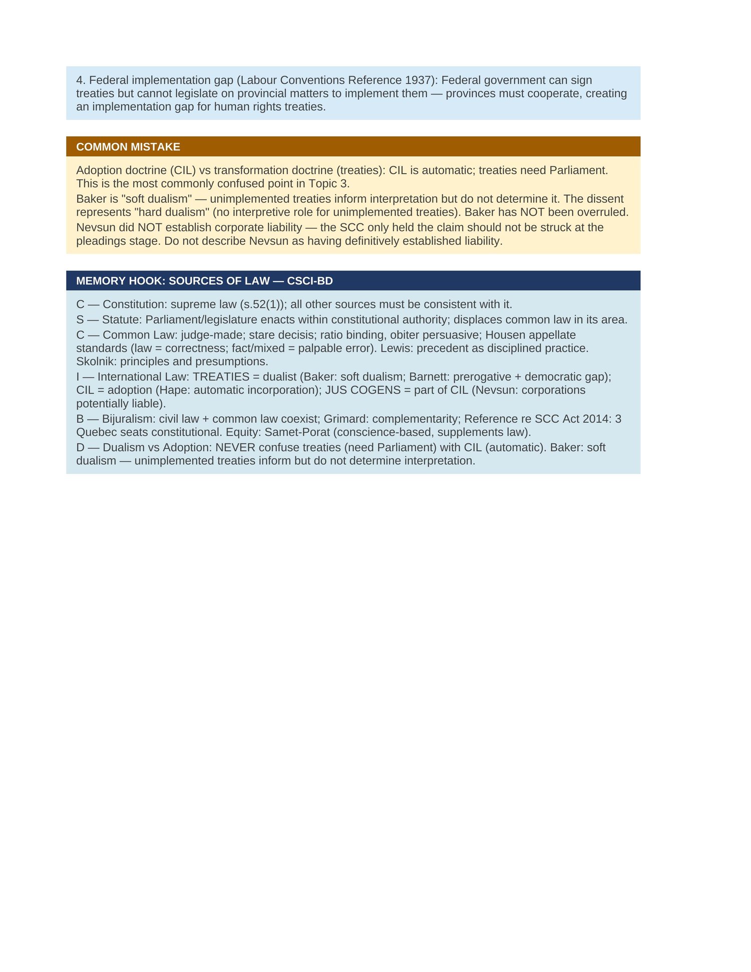 Topics covered across 10 Parts: legal theory including positivism, natural law, feminist legal theory, CLS, law and economics, and critical race theory. Indigenous law: Aboriginal title, duty to consult, self-government, treaties, TRC and UNDRIP. Sources of law: common law, civil law, bijuralism, stare decisis, international law. Constitutional principles: rule of law, constitutional supremacy, parliamentary sovereignty, federalism, separation of powers, judicial independence. Courts and judiciary. Parliament and executive including Crown prerogative. Statutory interpretation: the modern purposive approach, Driedger formula, bilingual and bijural interpretation. Administrative law: the Vavilov standard of review framework, procedural fairness and the Baker 5-factor test, grounds for judicial review.