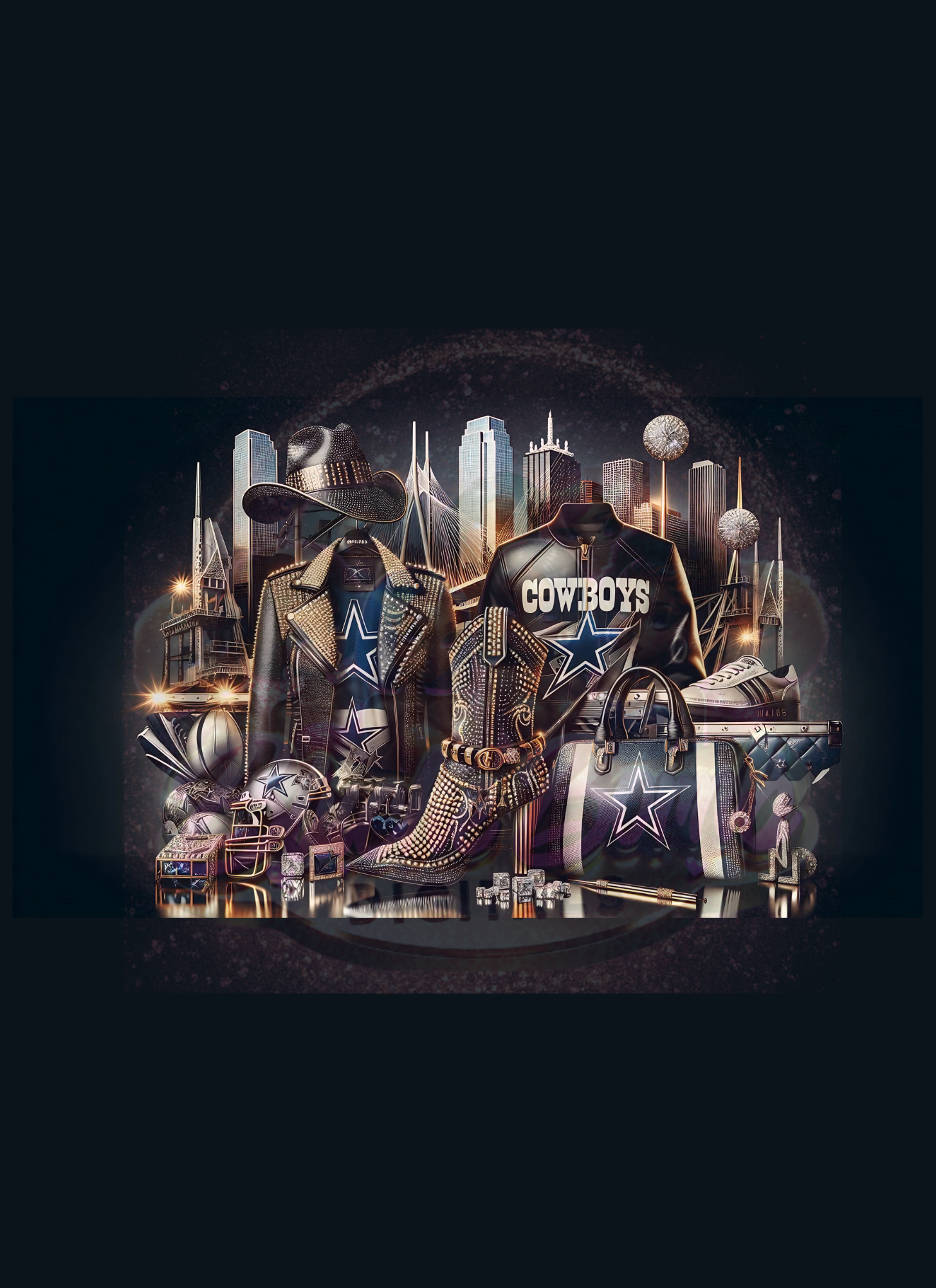 Elevate your game day spirit with this luxurious Dallas Cowboys-inspired fashion and decor digital artwork. This high-quality PNG features an opulent display of Cowboys-themed fashion items, including a sleek jacket, chic handbag, and stylish boots, all set against a backdrop of golden accents and glowing lights. Perfect for creating standout sublimation prints, digital projects, or unique game-day decor!