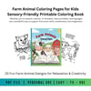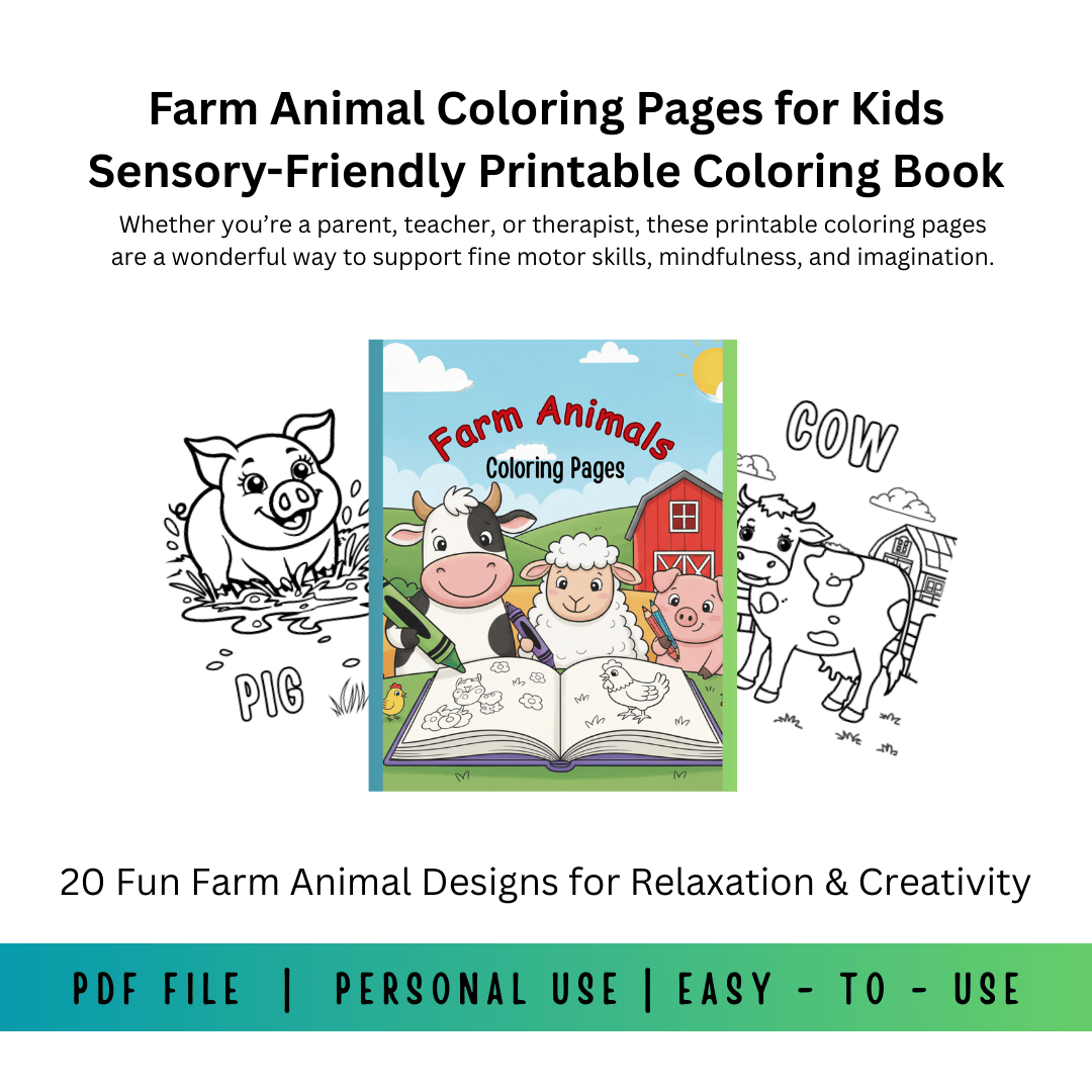 Enjoy 20 charming, sensory-friendly coloring pages designed for little hands and sensitive eyes. Featuring bold lines and friendly animals like cows, pigs, and sheep, this printable bundle promotes focus, fine motor skills, and calm. Perfect for parents, teachers, and therapists seeking a mindful, creative activity.