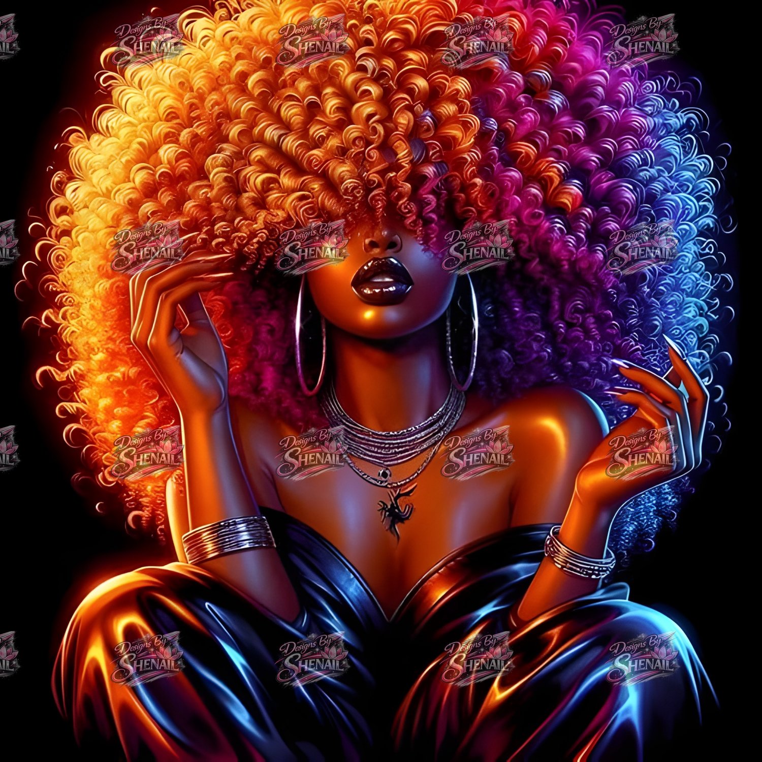 This high-resolution luxury clip art features a stunning Afro-glam woman with voluminous tri-tone curls blending fiery gold, deep magenta, and electric blue hues. Her curls softly veil her eyes, creating a mysterious, elegant, high-fashion editorial look. Her glowing skin, glossy lips, layered silver jewelry, and confident pose embody power, beauty, and divine feminine energy.