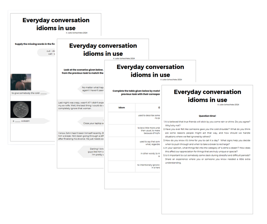 A thematic worksheet aimed to enrich your students day-to-day conversations by familiarizing them with five idioms/phrases for everyday use (to call it a day, a dime a dozen, to give somebody the cold shoulder, to cut somebody some slack, come rain or shine).
