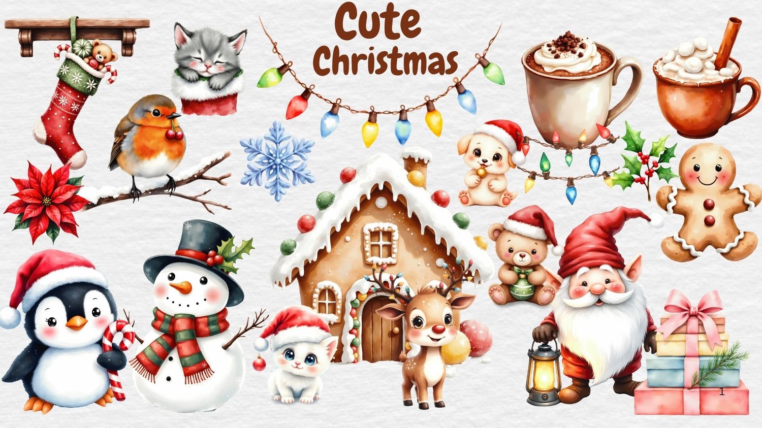 Watercolour Cute Christmas clipart. 20 individual transparent PNG files. Everything you need for your Christmas designs! Sublimation, print, DTF, UVDTF. Christmas PNG.