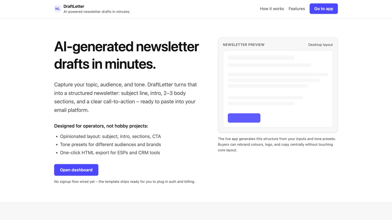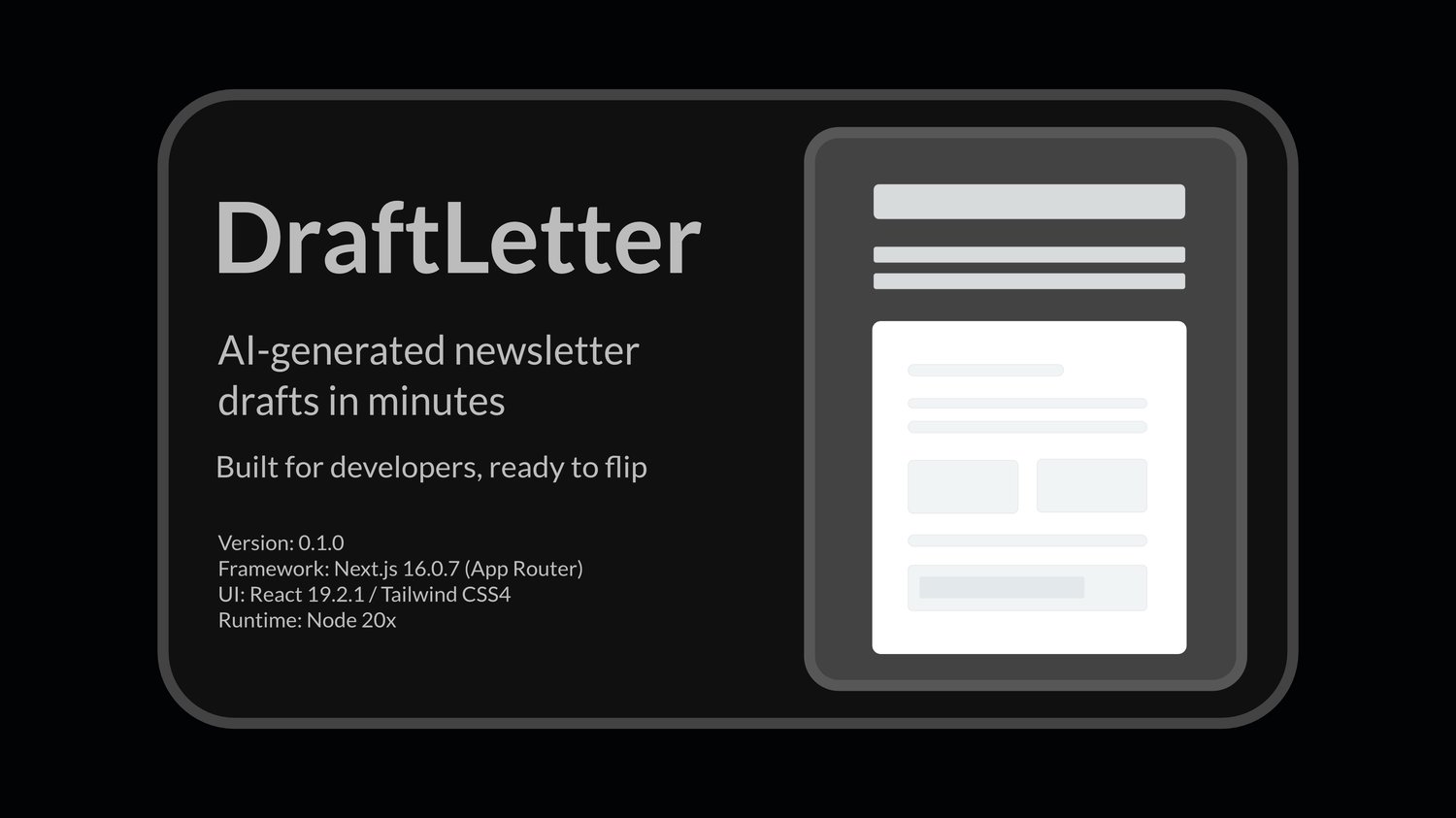 DraftLetter is a production-ready newsletter draft workflow for developers and agencies who need consistent, repeatable newsletter output without rebuilding generation logic and UI from scratch.