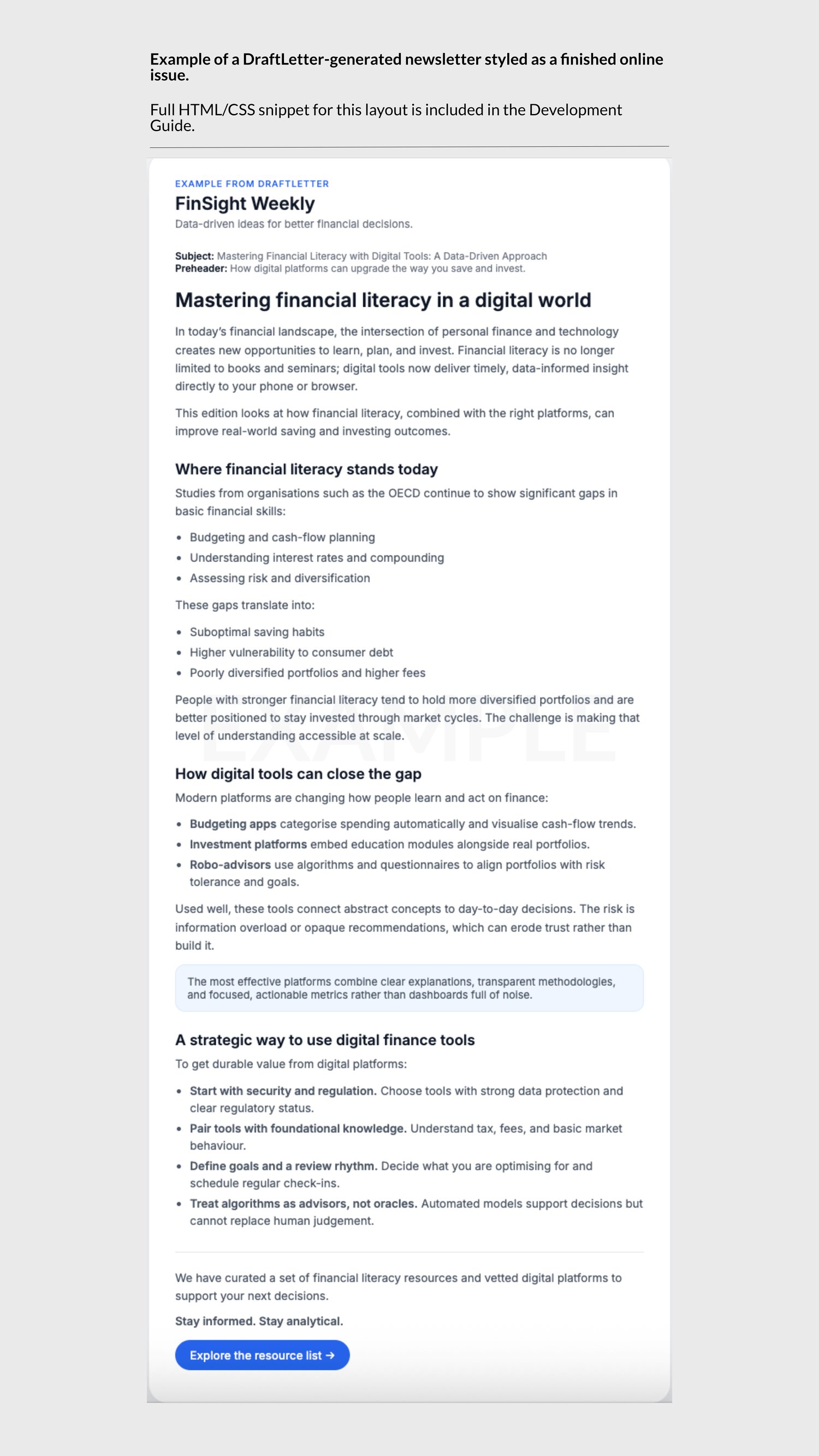 • Example styled HTML newsletter included in the guide
