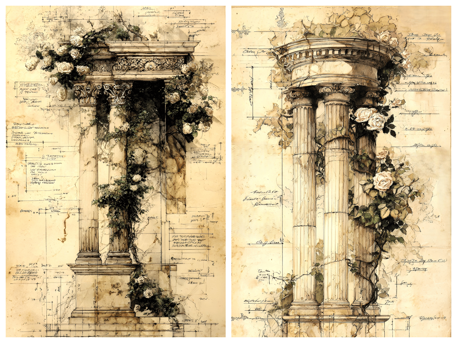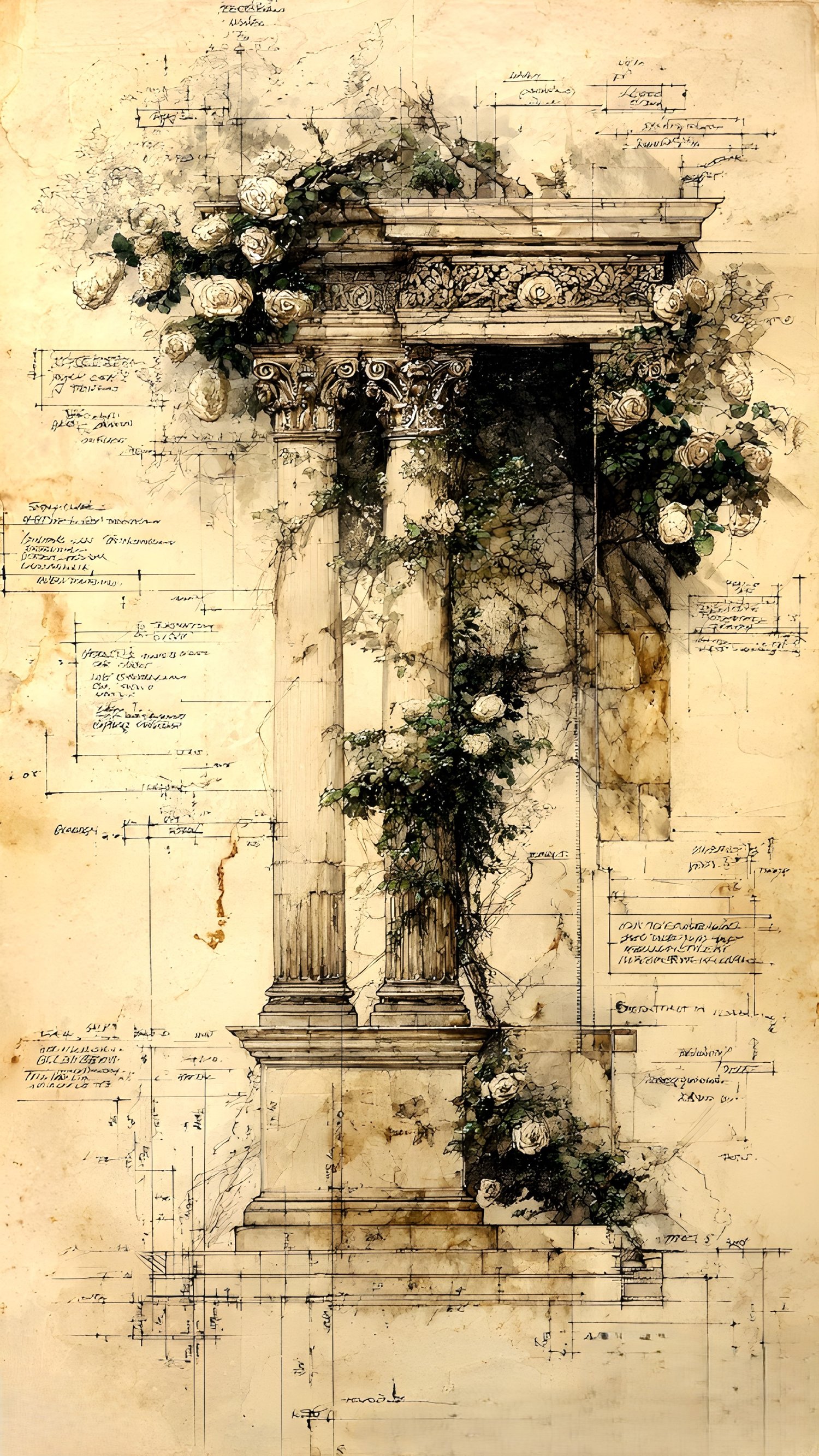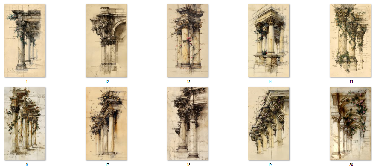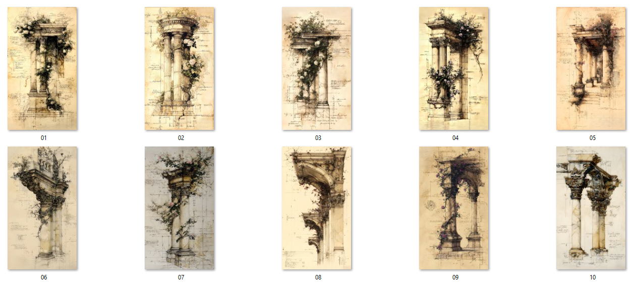 20 unique JPG files. AI-generated base, curated and hand-finished by an architect. 300 DPI print-ready resolution, 2700×4800 px portrait format (9:16 ratio) of ornate classical colonnades, arches, and pillars entwined with climbing roses, ivy, and trailing botanicals, all rendered in a warm aged-parchment aesthetic with detailed architectural sketch overlays. Ready for crisp, professional printing at any scale. Decorative asemic writing, vintage scans, some with original marks. Instant digital download, no physical item will be shipped. Commercial use for small business included. File resale prohibited.