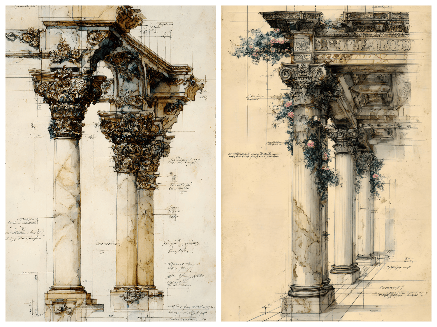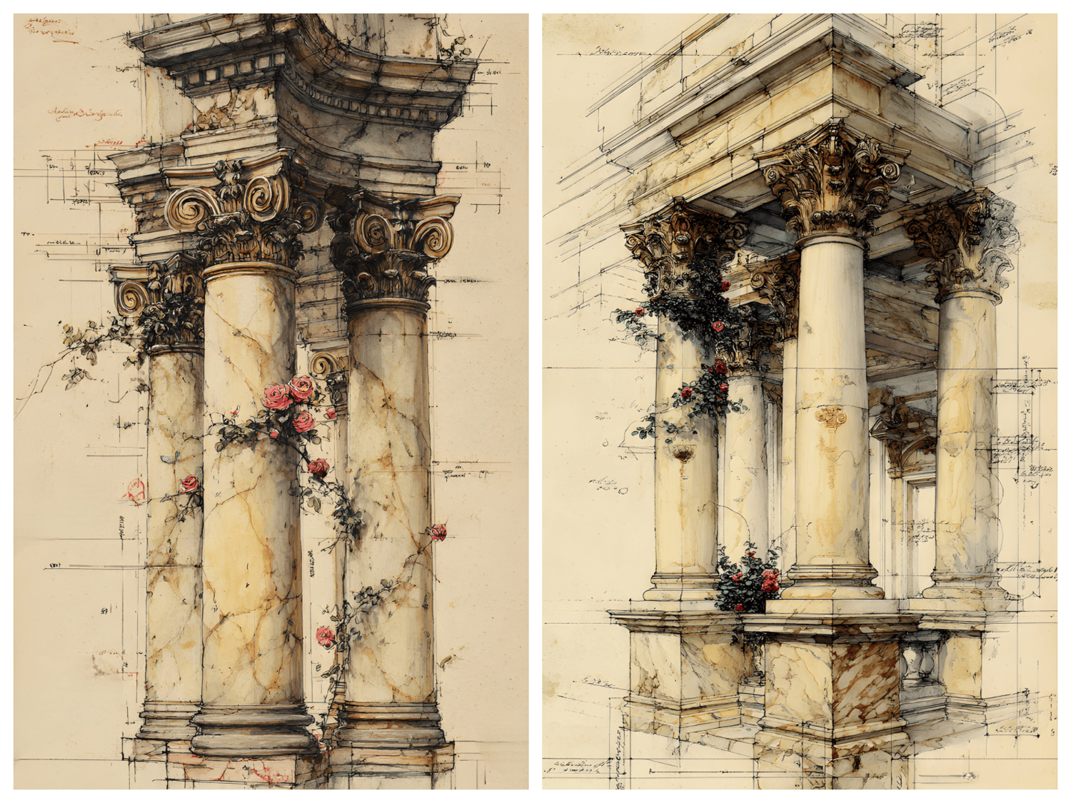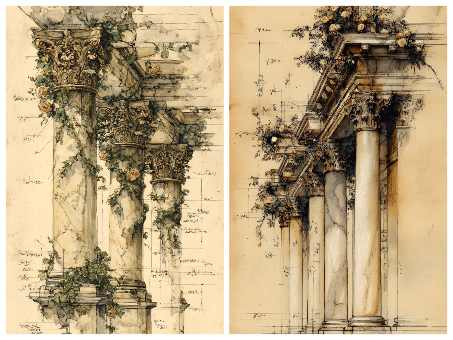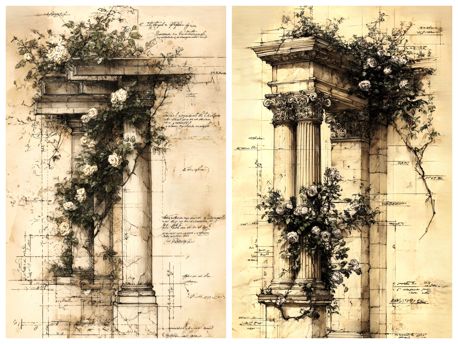 20 unique JPG files. AI-generated base, curated and hand-finished by an architect. 300 DPI print-ready resolution, 2700×4800 px portrait format (9:16 ratio) of ornate classical colonnades, arches, and pillars entwined with climbing roses, ivy, and trailing botanicals, all rendered in a warm aged-parchment aesthetic with detailed architectural sketch overlays. Ready for crisp, professional printing at any scale. Decorative asemic writing, vintage scans, some with original marks. Instant digital download, no physical item will be shipped. Commercial use for small business included. File resale prohibited.