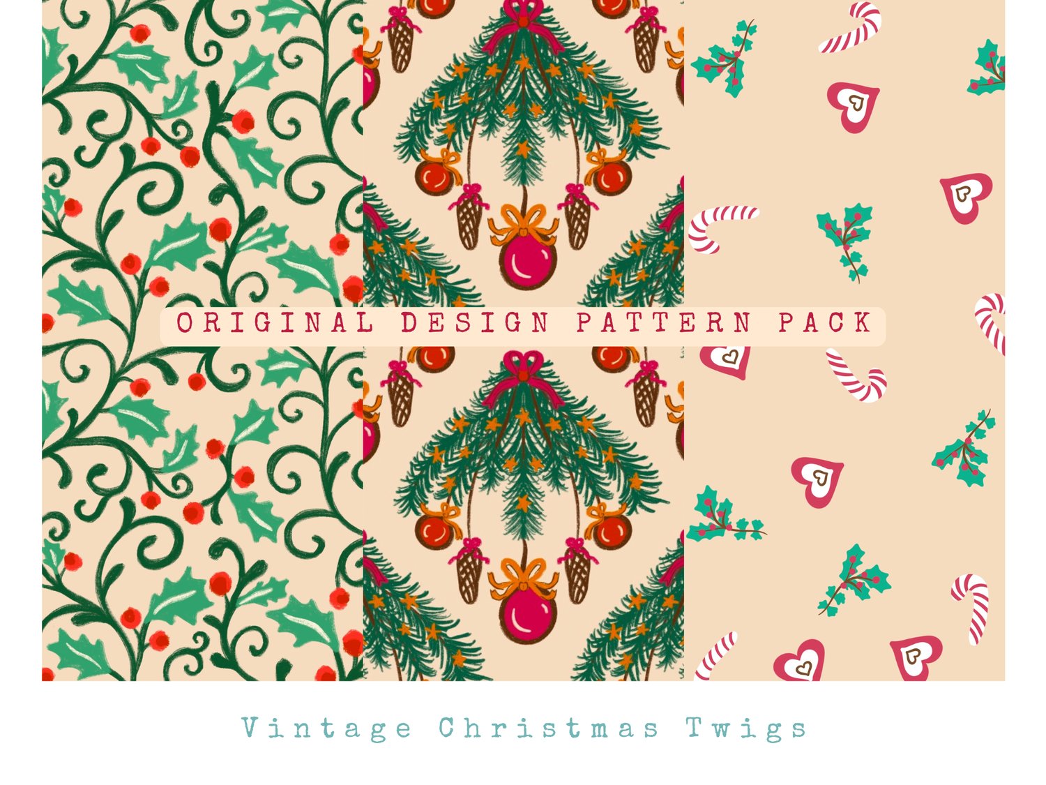 Vintage Christmas Twigs Pattern Pack – Hand-Drawn Holly & Fir Digital Paper + seamless files