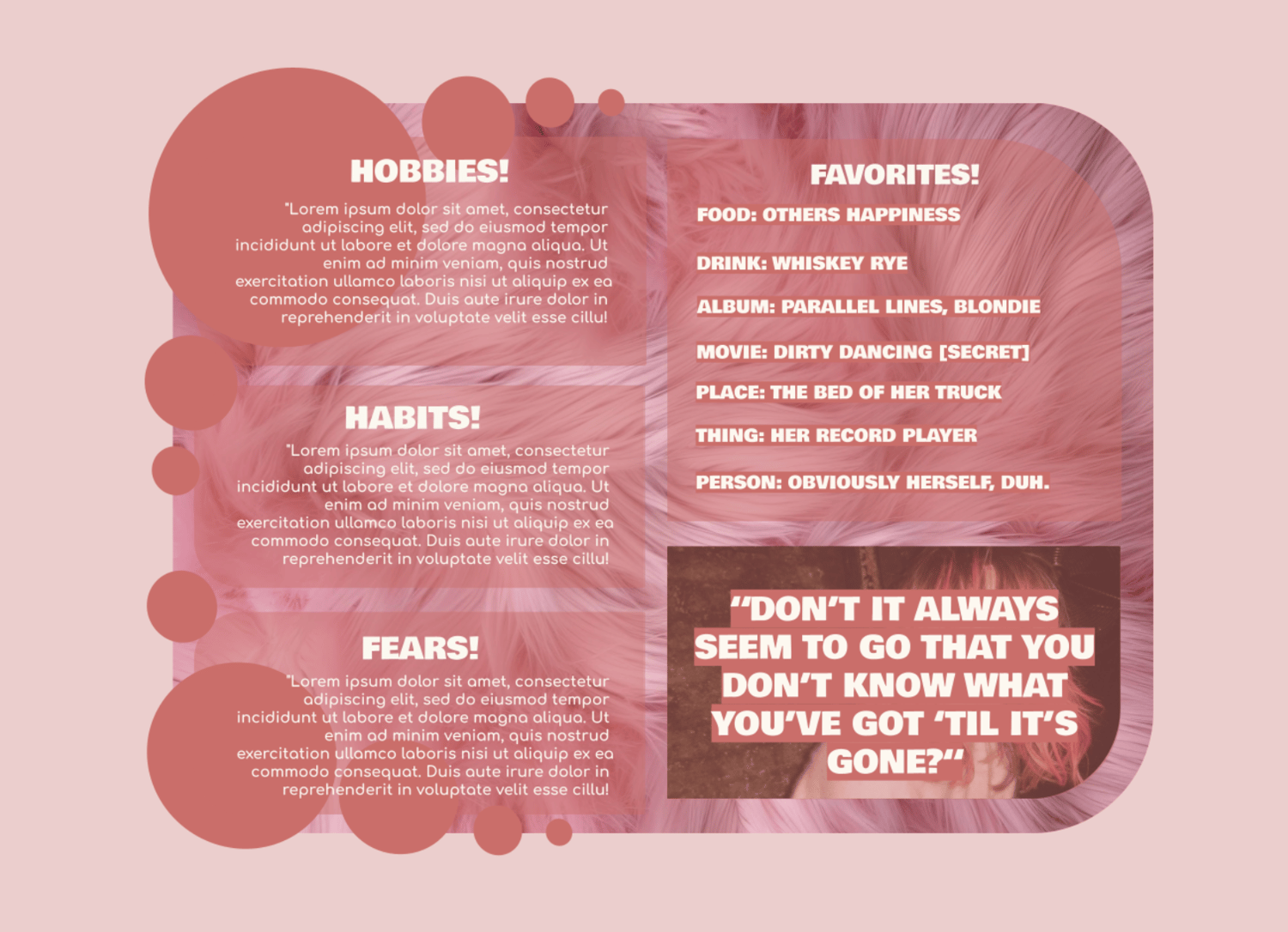 - A ‘GET TO KNOW ME’ PAGE WITH SPACE FOR HABITS, HOBBIES, FEARS, FAVORITES, AND A QUOTE —
