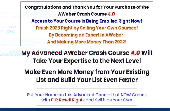 My Advanced AWeber Crash Course 4.0 Will Take Your Expertise to the Next Level. Make Even More Money from Your Existing List and Build Your List Even Faster. Put Your Name on this Advanced Course that NOW Comes with PLR Resell Rights and Sell it as Your Own.