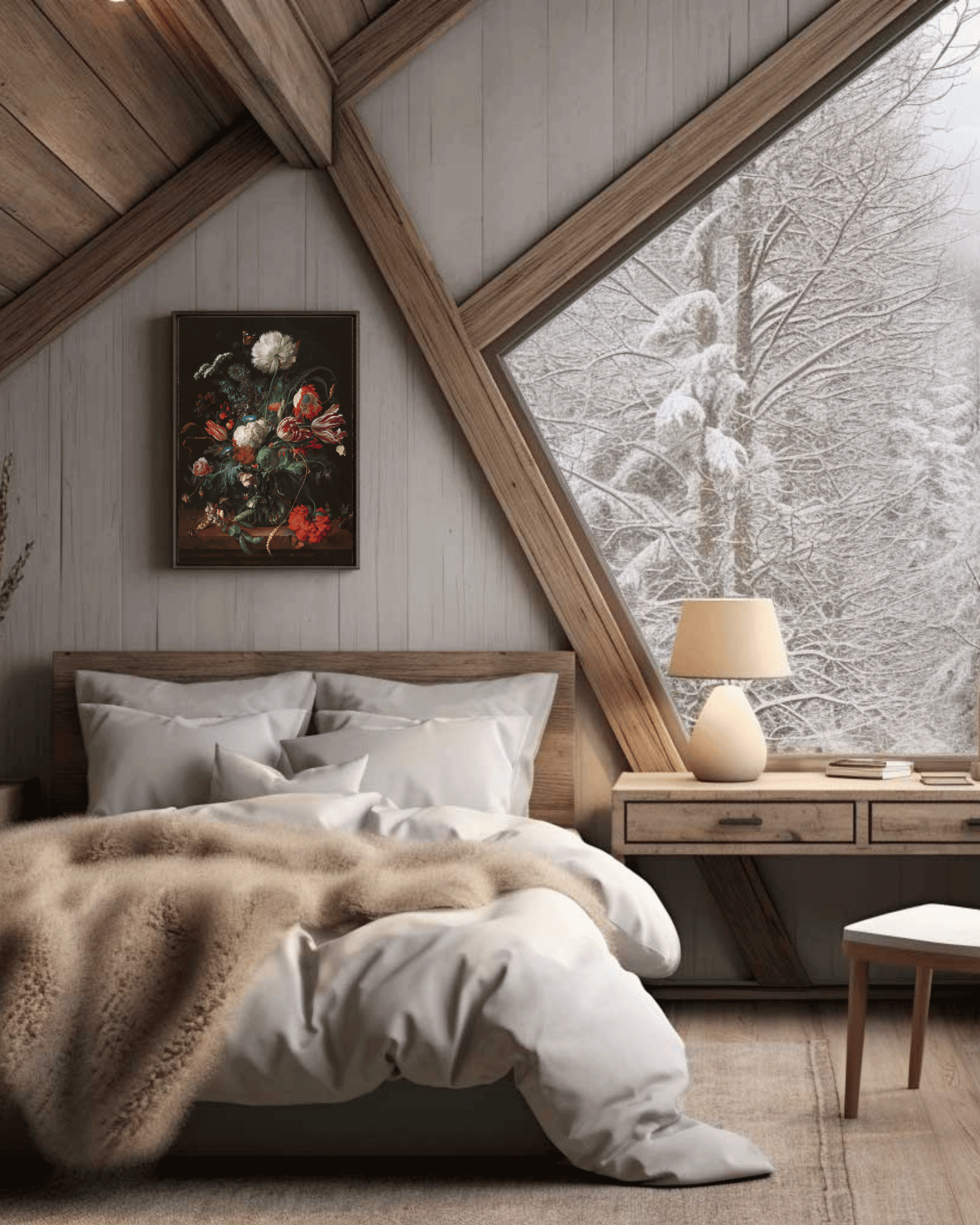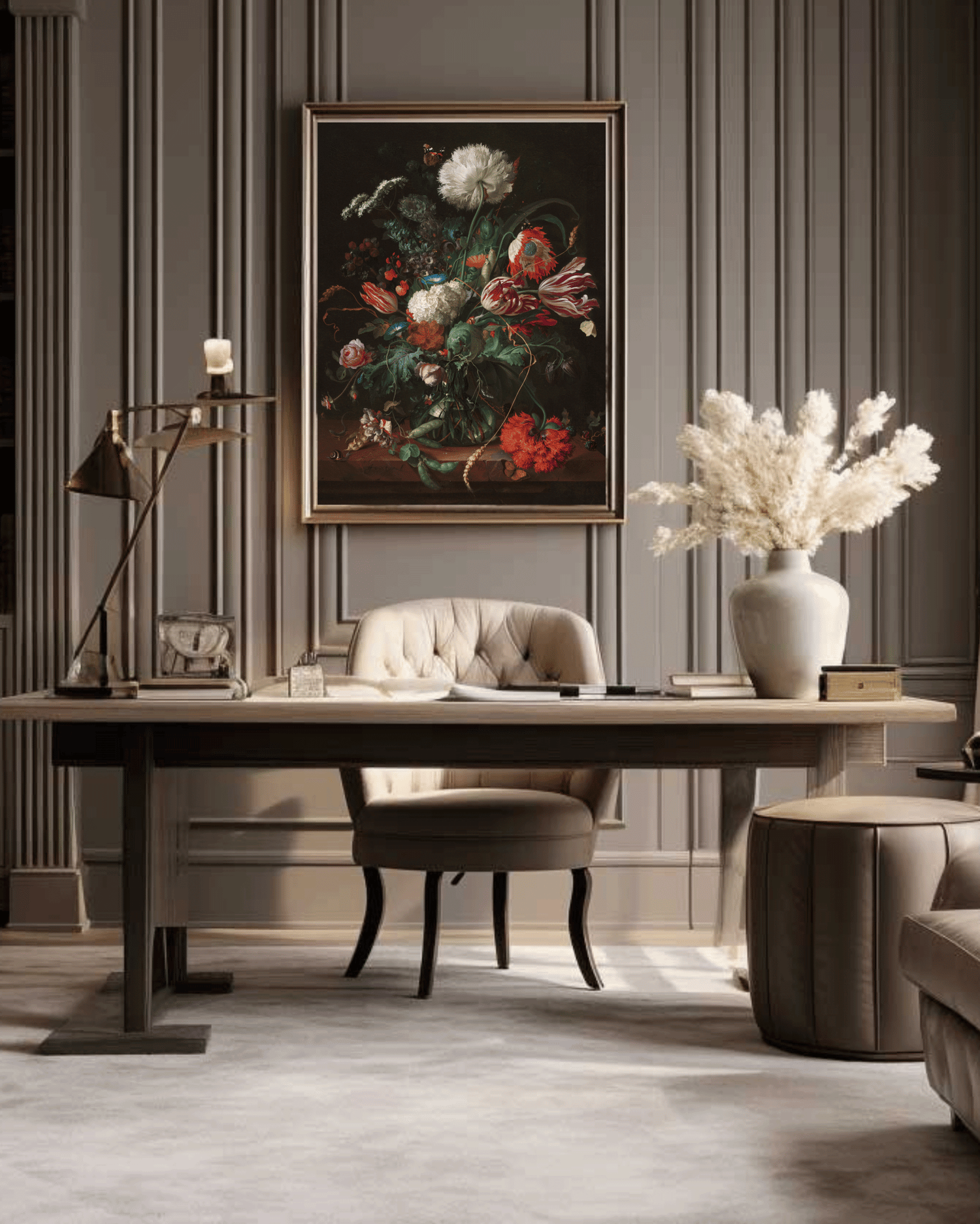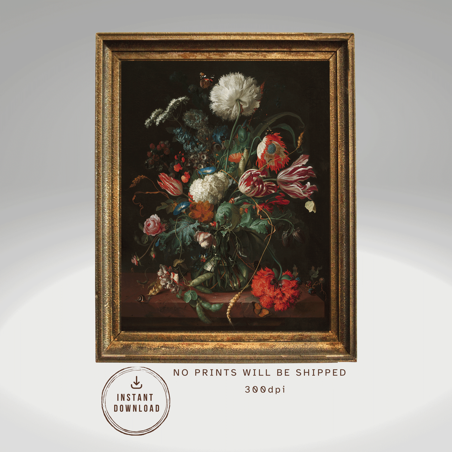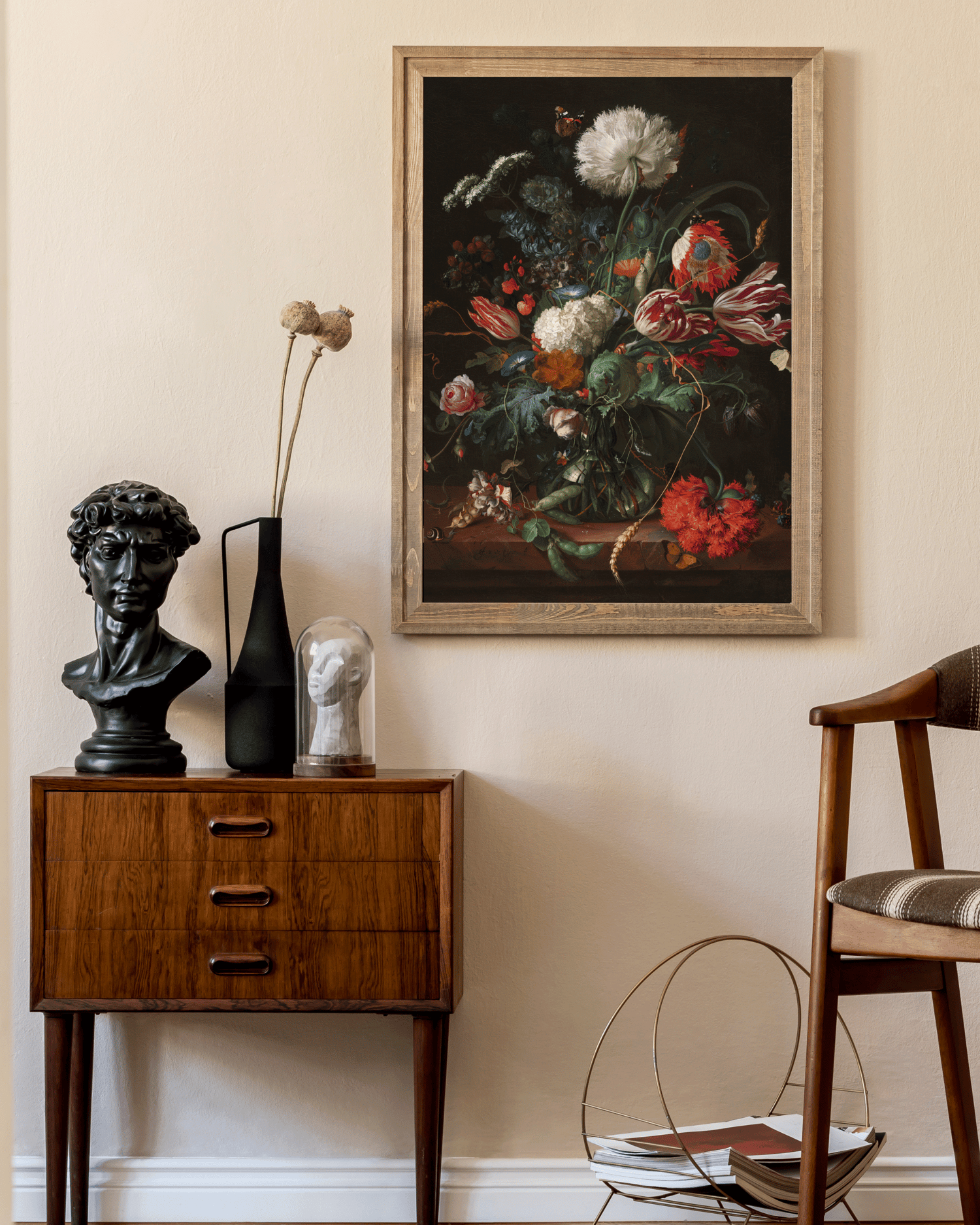 Embrace the allure of the past and enrich your home with the captivating charm of vintage paintings. Vase of Flowers, a replica of still life painting by Jan Davidsz de Heem, circa 1660, brings the essence of Dutch Golden Age art into your home, celebrating the beauty of life’s fleeting moments through exquisitely rendered botanicals. This vintage masterpiece embodies the richness and opulence of Dutch Baroque art, where every petal and stem holds centuries of artistic tradition.
