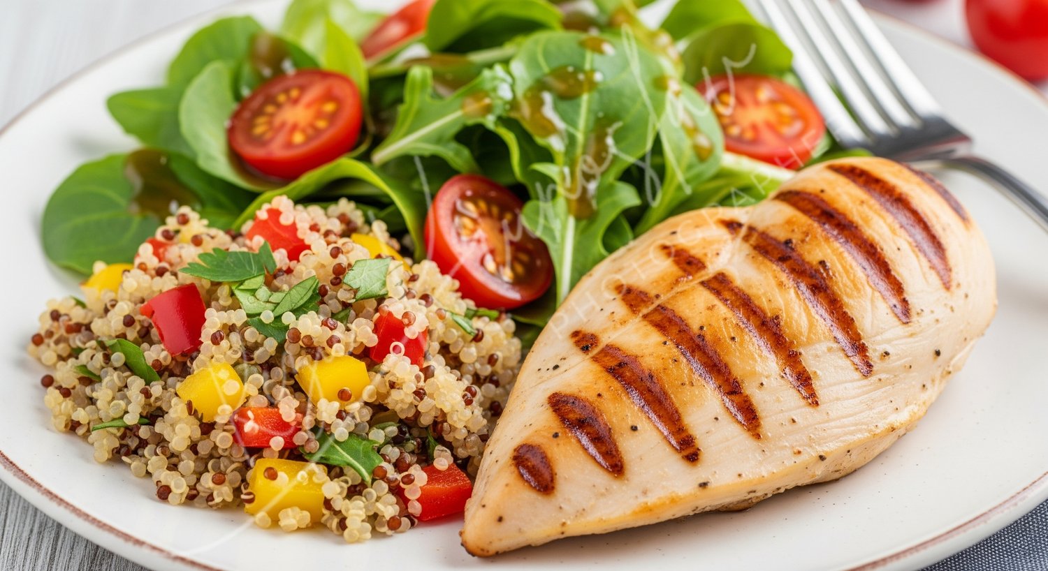 Inspire your audience with the perfect balance of protein and superfoods. This high-resolution image captures a beautifully seared chicken breast with perfect grill marks, served alongside a vibrant quinoa salad mixed with diced bell peppers. A fresh side of baby spinach and cherry tomatoes completes this wholesome, "clean eating" meal.